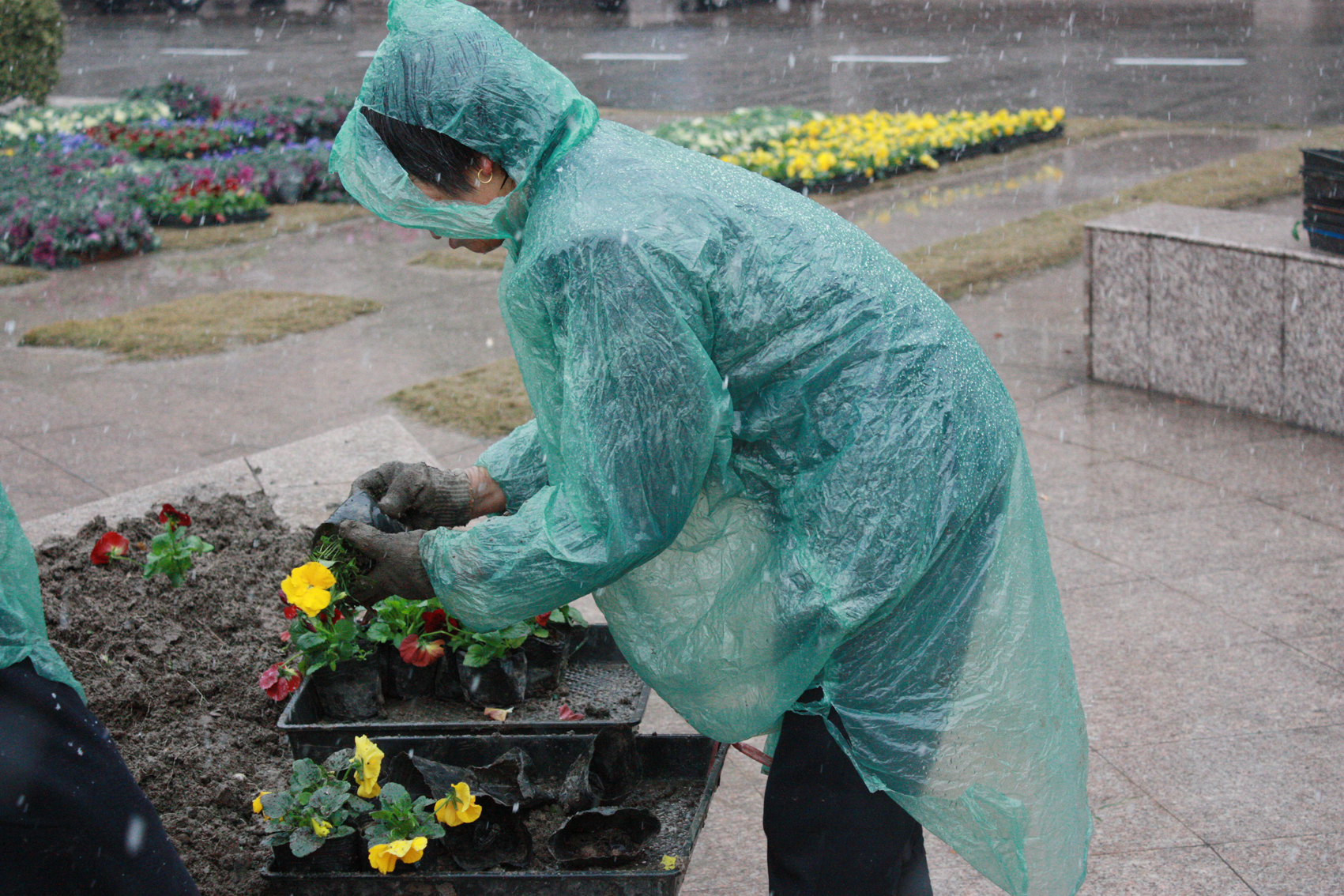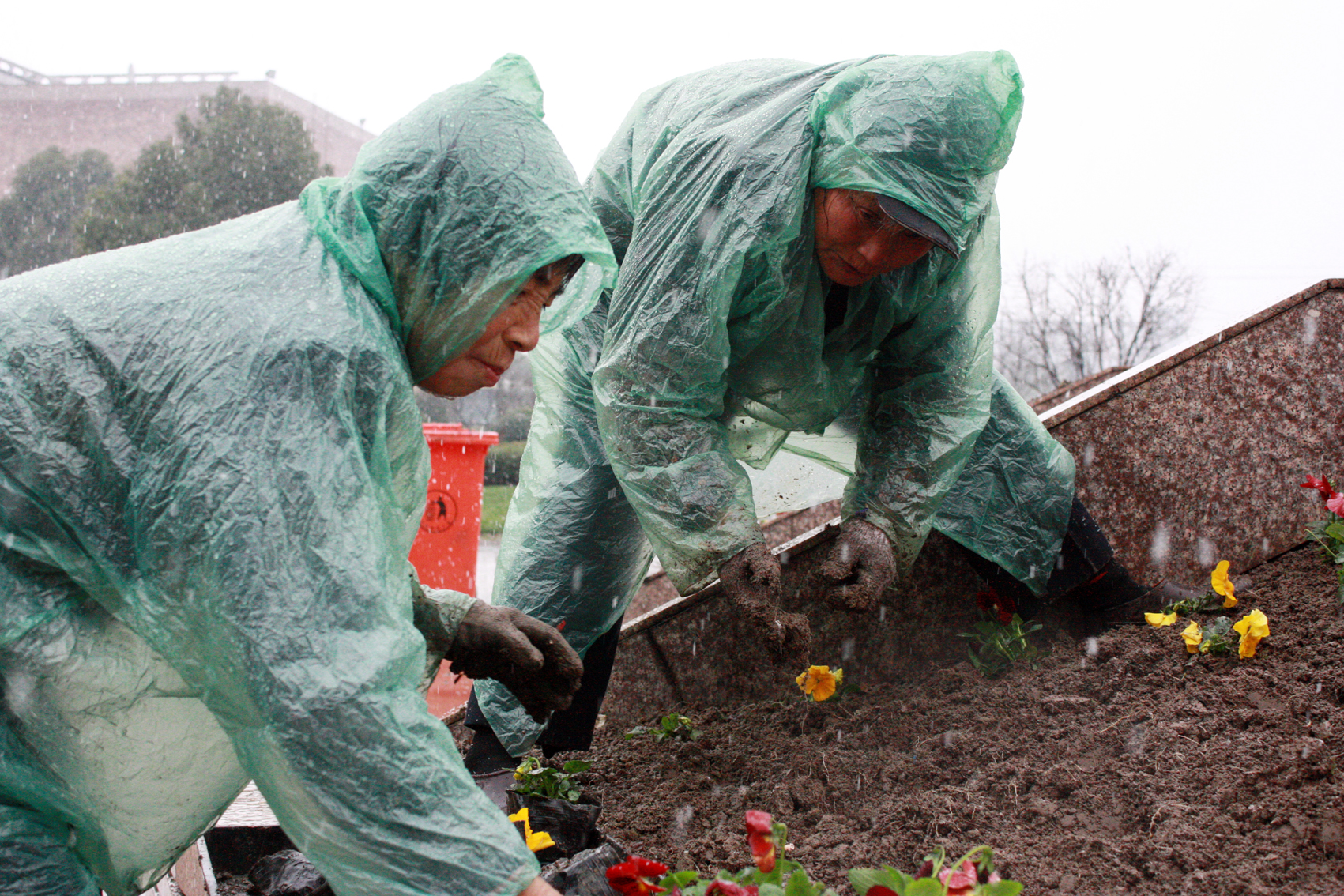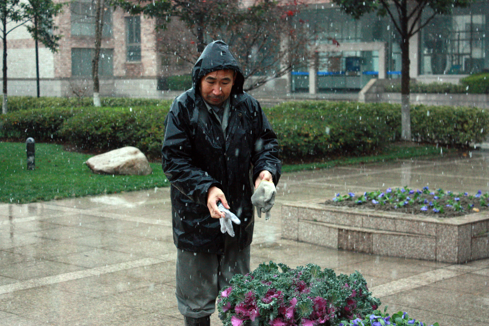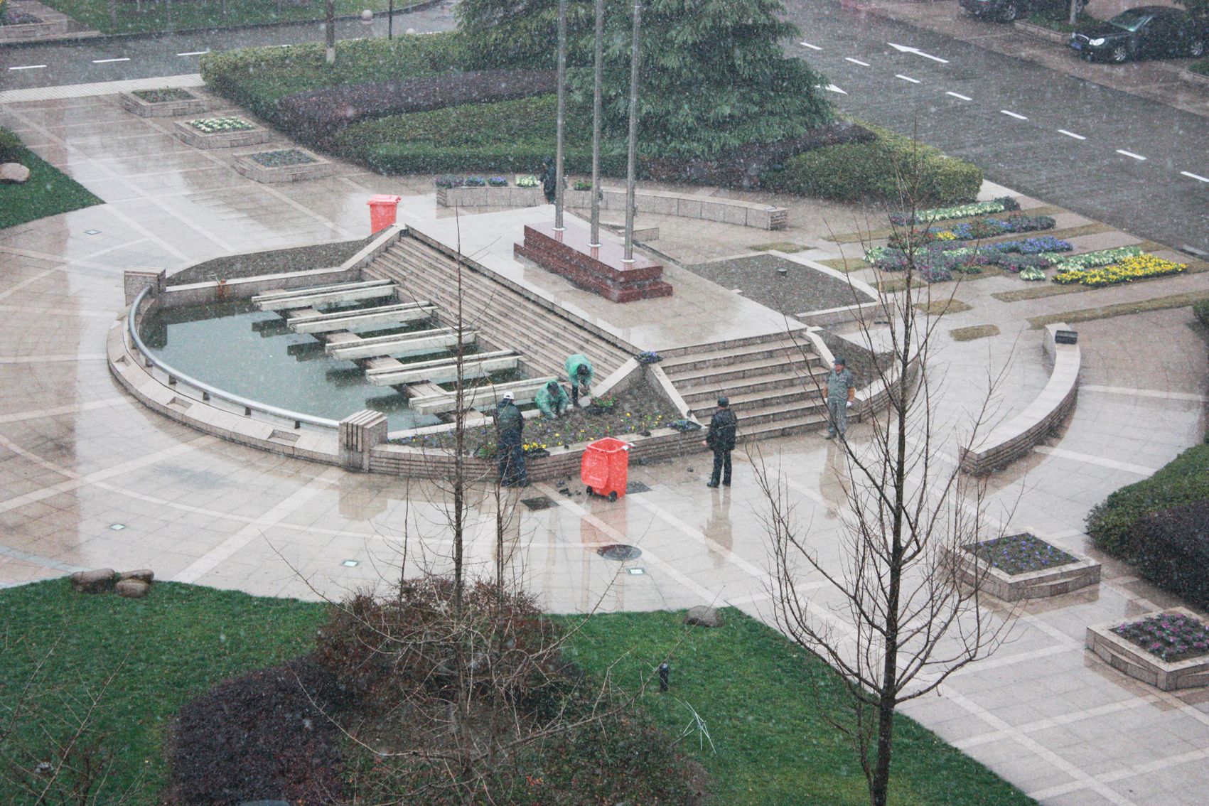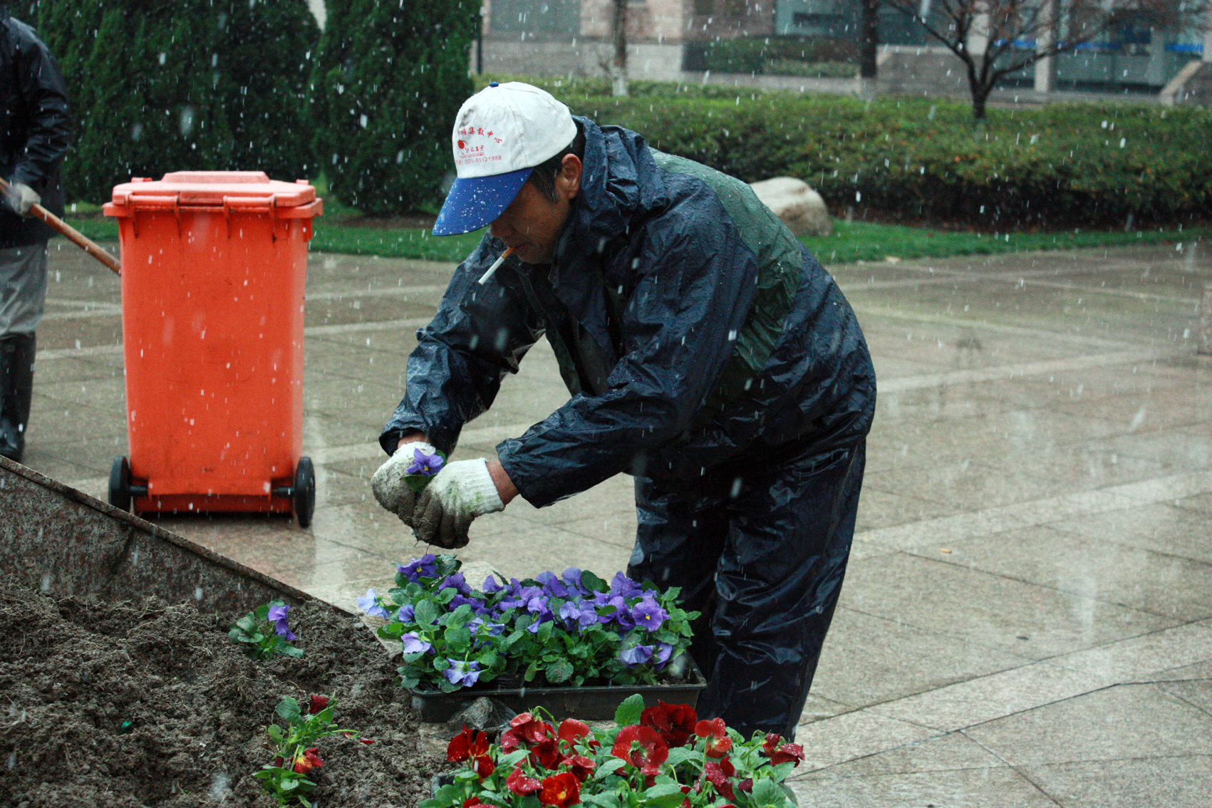 “大伯,这么冷的天,怎么还在工作?”“花运到了,要及时把它们植入泥土,不然就不鲜艳啦!”顶着寒风与飘雪,只为这小小的点缀,更好地美化我们的校园。