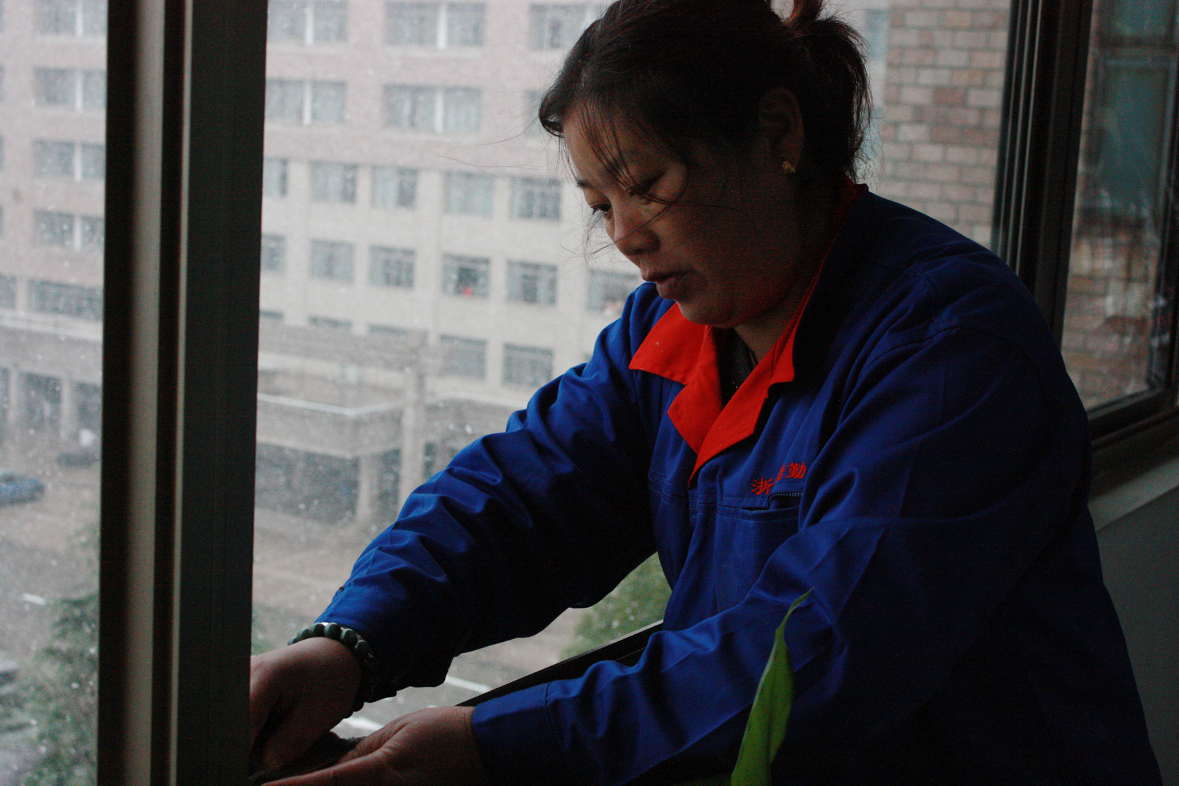 可身旁的阿姨迎着凛冽的风清洁着窗槽,发丝在风中凌乱,窗外是遥遥坠落的雪花。