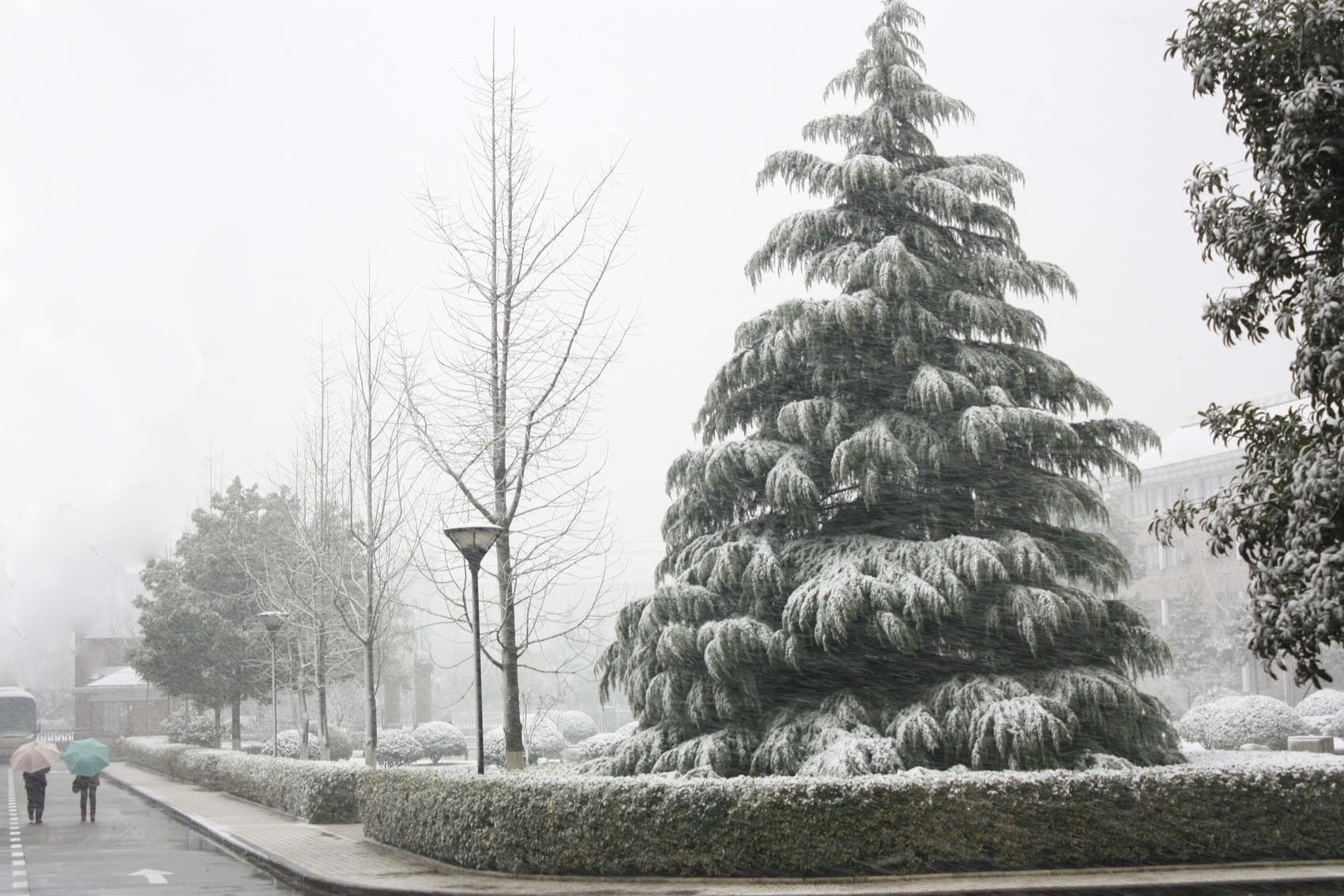 雪越下越大,顷刻间将绿色植物覆盖,一眼望去白茫茫一片。南方罕见的雪天,放学后的学生们在雪中嬉戏、追跑,校园里回荡着欢快的笑声。