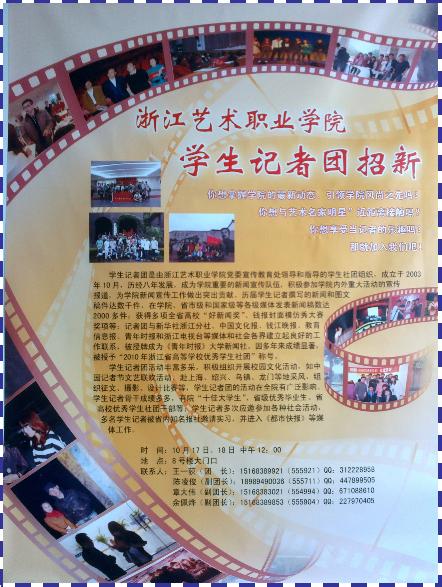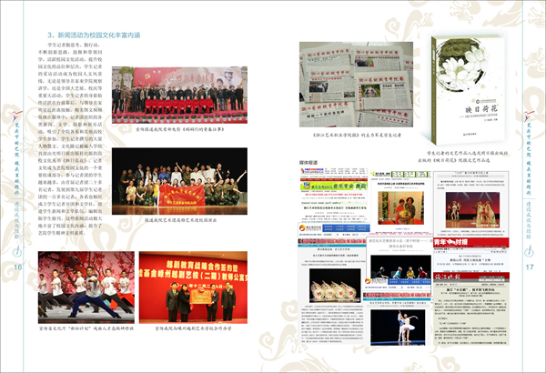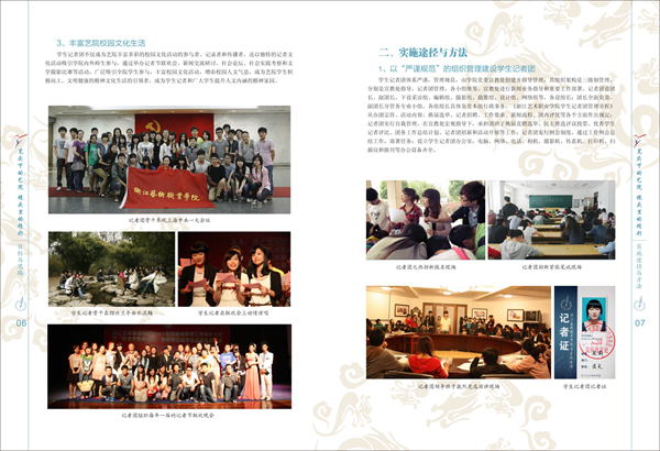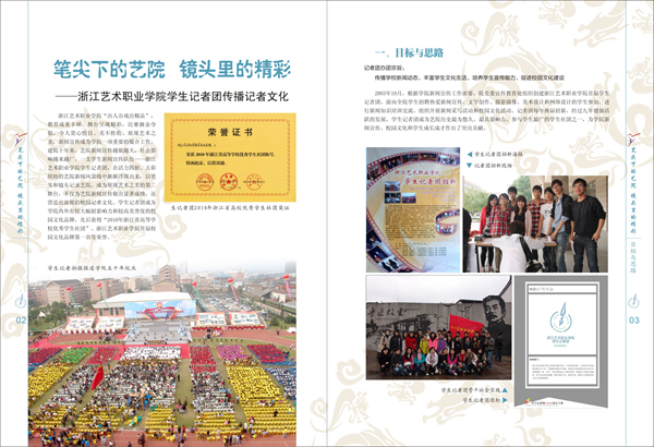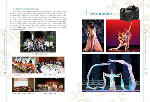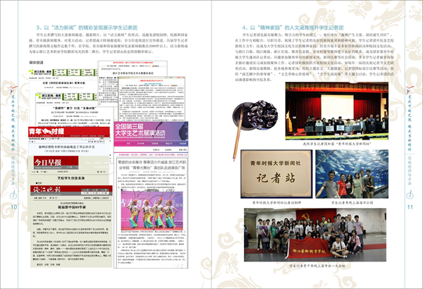 以艺术为表征的艺术专业美在舞台艺术精彩呈现,以学生记者团为主体的学院新闻宣传工作,为艺术之美的展现锦上添花,架起艺术与受众的桥梁。通过学生记者撰写的新闻报道和拍摄的新闻图片,社会各界较为全面地了解到艺院教育教学成果,看到了学院的发展历程。如学院音乐剧《五姑娘》获文华大奖、参加“桃李杯”全国舞蹈比赛获金奖、参加全国大学生艺术节、学院“综合展演季”演出、“浙江潮”文化论坛、高雅艺术进校园、“新松计划”人才培养、教学改革创新、评估示范建设、党建思政教育、招生招聘和校园文化活动等,通过学生记者得到宣传传播,使这些重要活动留下美的记忆。