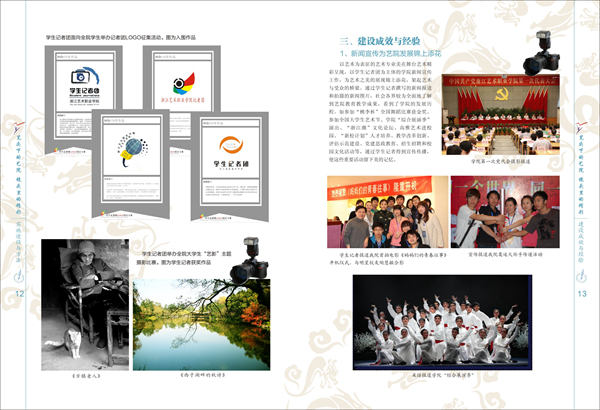在校园新闻宣传和文学活动中,学生记者团勤思考、勤行动,不断创新思路,鼓舞和带领同学,活跃校园文化活动,提升校园文化的品位和层次,艺院学生能“舞”不能“文”的认识误区通过学生记者团的新闻活动,在很大程度上得到改变,学生记者的采访活动成为校园人文风景线。无论是省部领导来学院视察,还是文艺名家来学院讲学,无论是全国大学生艺术展演,还是校庆、电影开机仪式、综合展演季等重要活动,学生记者的身影始终活跃在台前幕后,与领导名家明星近距离接触,精美图文频频展现在媒体中;记者团组织的庆祝记者节联欢会、滨江高校学生新闻工作交流会、主题摄影比赛、主题征文比赛、记者团标志征集等活动,参与学生遍及全院各系和其他高校;学生记者撰写的大量人物散文、文化随记被编入学院首部由光明日报出版社出版的高校文化丛书《映日荷花》。记者文化成为艺院校园文化的一个重要组成部分,参与记者团的学生越来越多,由首届记者团二十多名记者,发展到第九届学生记者团的一百多名记者,各系也相应成立学生记者分团和文学社,组建学生新闻和文学队伍,编辑出版学生报刊。这些新闻活动极大地丰富了校园文化内涵,提升了艺院学生精神文明素质。