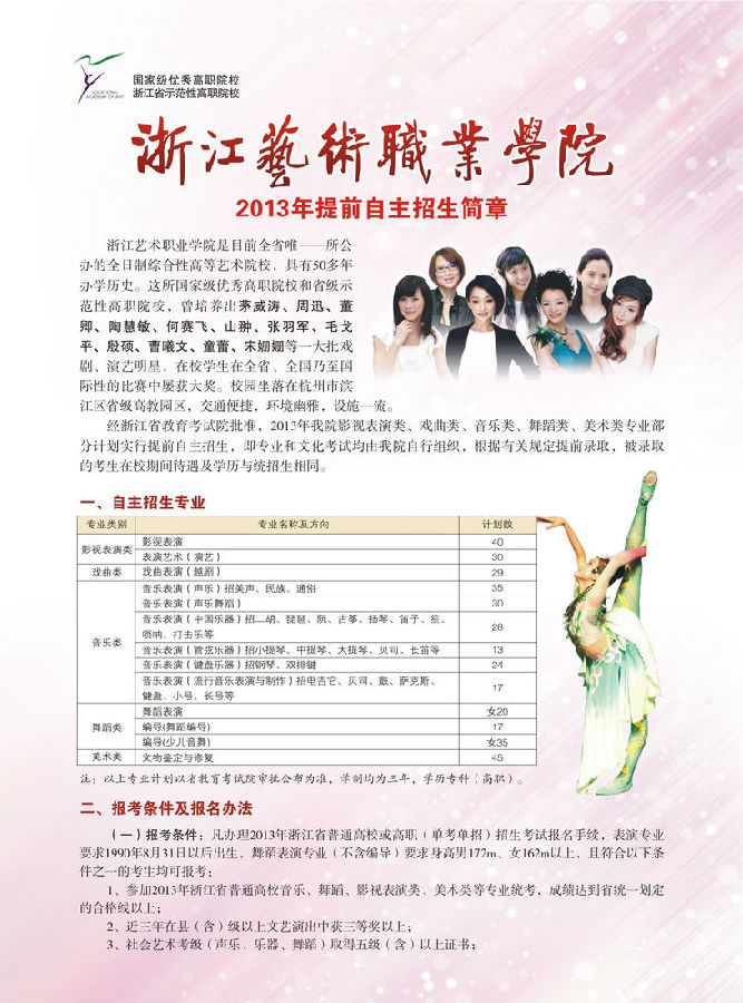 (一)报考条件:凡办理2013年浙江省普通高校或高职(单考单招)招生考试报名手续,表演专业要求1990年8月31日以后出生,舞蹈表演专业(不含编导)要求身高男172m、女162m以上,且符合以下条件之一的考生均可报考: