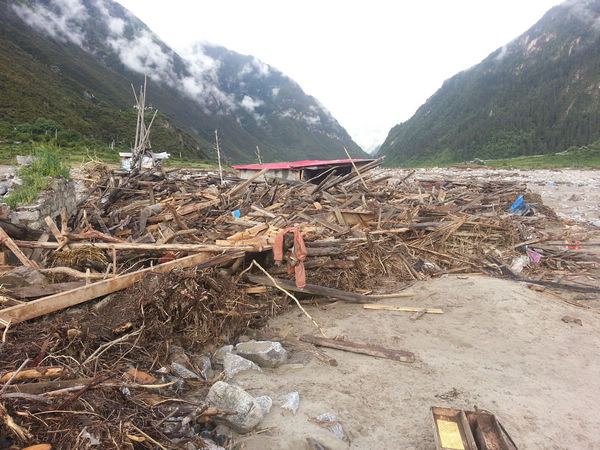 站在高处,一眼望去,尽是湍急的洪流呼啸而过。这洪流原是纯净的天上之水,却因为来得太急太猛烈,唤醒了藏域高原天然湖泊上游沉睡的冰川。冰川崩裂,滑入湖中,冲垮湖堤,河水暴涨,凶猛的河流就这样无情地肆虐。
