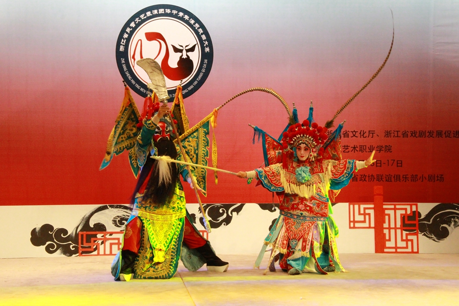 来自全省各地27个民营剧团的30名中青年演员汇聚一堂,高手如云,文戏、武戏样样齐全,比赛现场气氛热烈,高潮不断。由温州市鹿城区哈哈京剧艺术团选送的京剧《芦林坡》中的一丈青扈三娘,一对日月神刀舞起来虎虎生风,技艺精湛,或对打,或高空翻,或连做十几个跳跃,演员虽已40多岁,但表演功底扎实,为观众演绎了一个活脱脱的梁山女汉子。温州市平阳县红旗京剧团选送的京剧《八珍堂·行路》中的老旦表演真切,情感饱满。越剧《梁祝·回十八》中梁山伯的演唱细腻流畅,神态表情俱佳,赢得台下阵阵掌声和喝彩。婺剧《水擒庞德·巡营》中的关公,一张红脸吸引了众多的眼球,浑厚的唱腔、豪迈的性格,精致的服装,一出场,就有许多观众上前拍照。在众多参赛选手中,还有一位“90后”演员前来参赛,表演越剧《蝴蝶梦·劈棺》有板有眼,声情并茂,足可见当代传统的戏曲文化不仅老一辈的甚是喜欢,也有年轻人追逐。