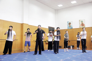 昨天下午,为学员们上课的是陈少云。教的是《萧何月下追韩信》中萧何的戏,统一戴着髯口的学员们环绕在陈少云左右,跟着他一招一式,一字一句地学,眼睛一齐瞪,胡子一齐抖,身体一齐摇晃,颇为壮观。