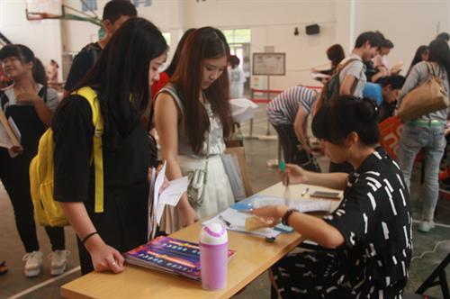 学院体育馆已早早开启迎新模式,横幅挂起来,指引牌贴起来,一溜桌子椅子排开来,学长学姐各就各位,引导答疑。认真的保安也一丝不苟地开始维持秩序,“对不起,家长留步,请让学生自己办理报到手续”。