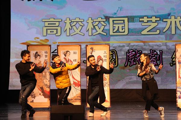 两部戏中间陈昭贤还设置了互动环节,经现场同学们的热烈推荐,三位男同学模仿三位美女王昭君、貂蝉和杨贵妃,三位女同学分别模仿三位英雄项羽、岳飞和关羽。因为歌仔戏的特色之一是角色反串,所以女生模仿英雄,男生模仿美女,模仿手势与走步,有的同学模仿得惟妙惟肖,引观众哄堂大笑,把演出的气氛推至高潮。