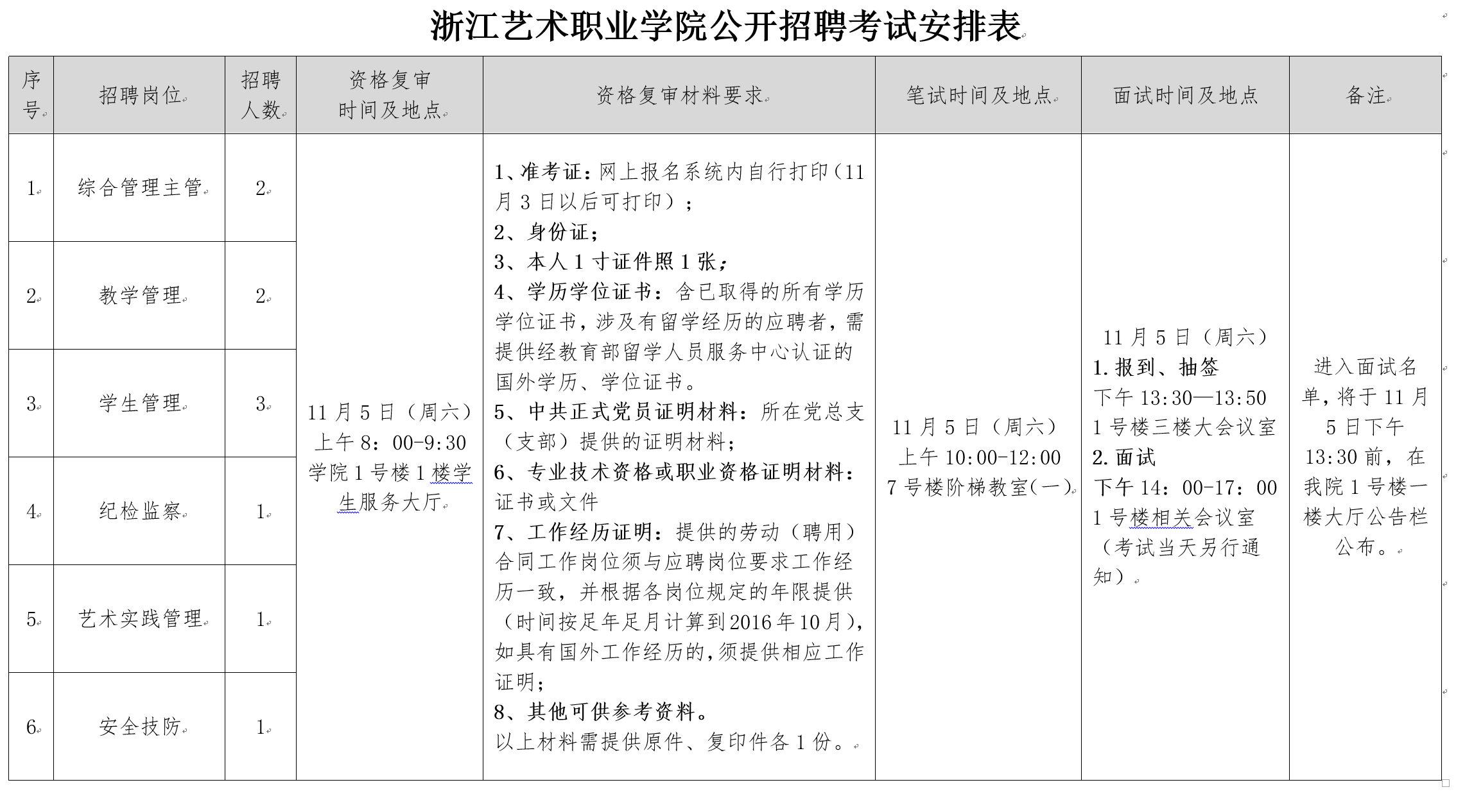 2.资格复审要求:资格初审合格人员请于11月5日(周六)上午8:00—9:30,携带本人相关材料(具体要求详见附件1)到学院1号楼1楼学生服务大厅参加资格复审。证件(证明)不全或者所提供的证件(证明)与报考资格条件不相符者,不能参加招聘考试,本人未按规定时间、地点参加资格复审的,视作放弃。