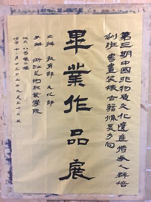 叶涛代表省文化厅非遗处发言。一声“同仁”,拉近了她与这群同样为非遗保护而努力的学员的距离。叶涛说,本期培训班汇集了各个省份的精英,班里卧虎藏龙、高手如林,所以在这次学习成果作品展中不仅看到了字画装裱和古籍修复,也看到了传拓、书画甚至剪纸、陶艺等。叶涛认为,在非遗的几大门类中,书画装裱和古籍修复是一个非常特殊的项目,它在传承中所体现的包容性,对别的门类的集聚性,都是别的项目所不拥有的。传拓、剪纸、陶艺等,都构成了书画装裱、古籍修复项目不可或缺的专业背景。可以说,如果其它的传统手工是为大众生活服务的,那么,书画装裱和古籍修复,其实是用一种手工技艺,来向我们的传统生活、精神生活进行追问。这不是草根文化,而是雅文化,是雅文化当中的精华。非遗传承不易,如何遵循文化部在十三五期间对非遗保护提出的“巩固抢救成果,提升传承水平”要求?叶涛说,这也是非遗传承人群培研计划的初衷:借助院校的力量,来提升传承能力和水平。如何找准定位,如何把握现代审美,如何与市场进行精确对接,这需要在对自身技艺进行要求的同时,思考与现代生活进行联接。她展望多年以后,学员们有的自成一派,有的发展成了我们的民族品牌,有的积累了巨大的社会财富,但他们仍会记得,在2016年,在杭州这个美丽的城市,在浙艺和老师同学的朝夕相处。