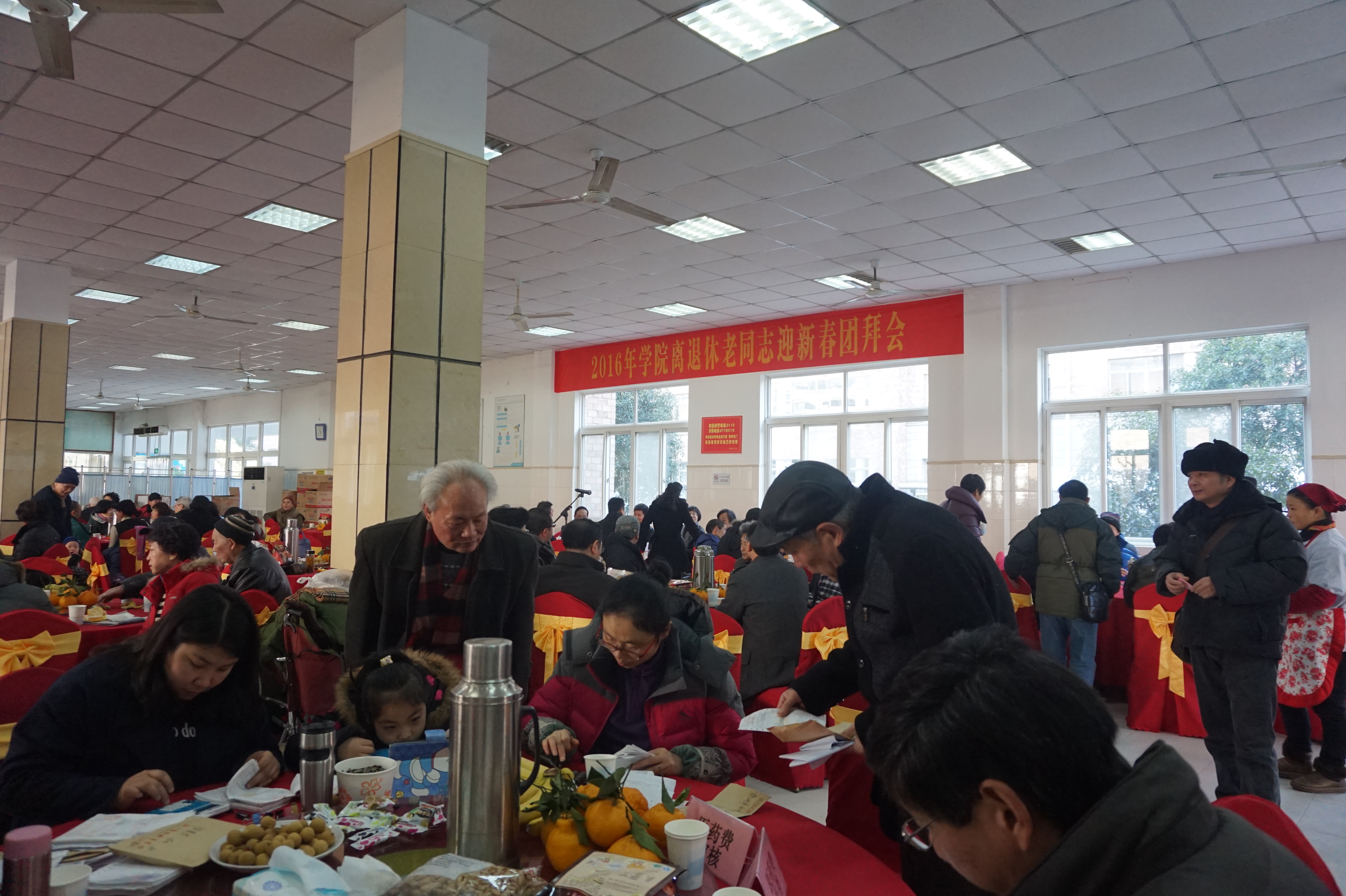 在零下10度的寒潮后,126日杭州迎来了阳光明媚的日子,浙艺也迎来了2016学院离退休老同志迎新春团拜会。团拜会在食堂举行,院领导朱海闵、张建国、黄杭娟、沈恒、夏开堂,学院各系和部分职能部门负责人代表,100多名离退休老同志等欢聚一堂。糖果茶点,甜蜜敬老;简约团拜,共绘新景。