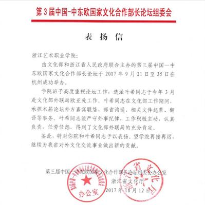 我校获第三届中国—中东欧国家文化合作部长论坛组委会和浙江省文化厅联合表彰