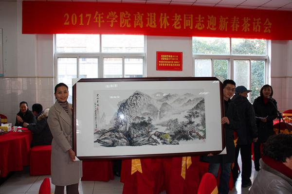 茶话会现场,影视技术系退休教师杨宝鸿将他精心创作的书画作品《云山春晓》赠送给学院,并向在场的全体同志致以新春的祝福。