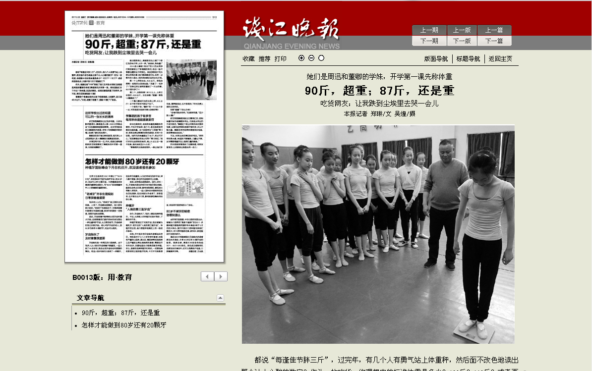 班长杜婉琳说,其实称体重是舞蹈系的惯例,不仅开学会称,每个月,甚至每周老师都会抽查体重。这个班里有位“小明星”贾川西,刚刚出演过韩寒的《乘风破浪》,长相十分甜美。她昨天的体重超过了90斤,有点不开心。“其实寒假没有怎么吃呀!”贾川西说,“我们平时也会控制饮食的,晚上6点以后一般不进食,每天运动至少5小时。”