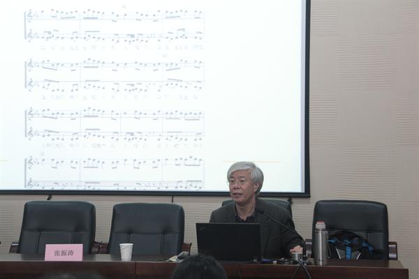 讲座中,张振涛老师通过充满激情地演讲、演唱和演奏告知大家,演唱中的韵词就是地道的中国味,带着乡土气息!中国的音乐,谱面信息只是骨干,真正的“血肉”在实践之中。采用状声字道出谱面没有的字以形成完整曲调的技术,民间称为“阿口”、“韵曲”(北京、冀中)、“哼哈”(西安鼓乐)。这些韵味只能在师承中获得,无法在谱面上得到。民间的表达法,就是这样以简驭繁,这是一种智慧、鲜活且可信的传统。