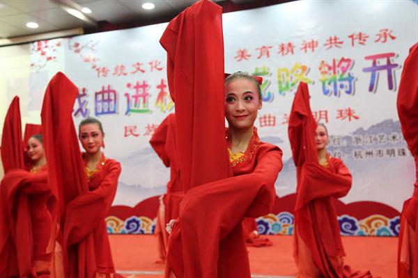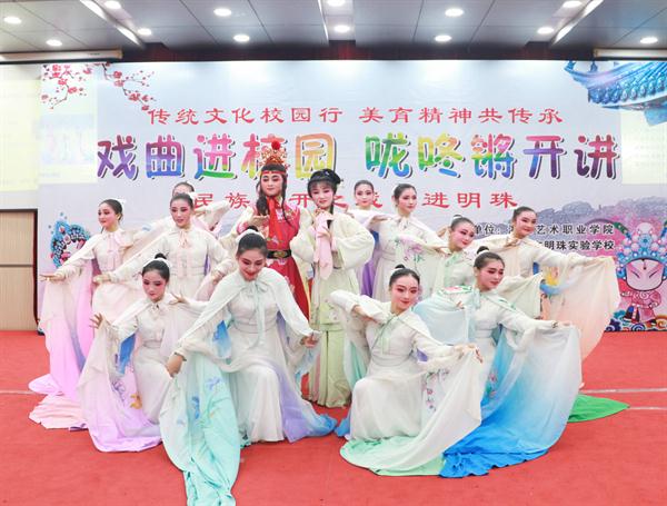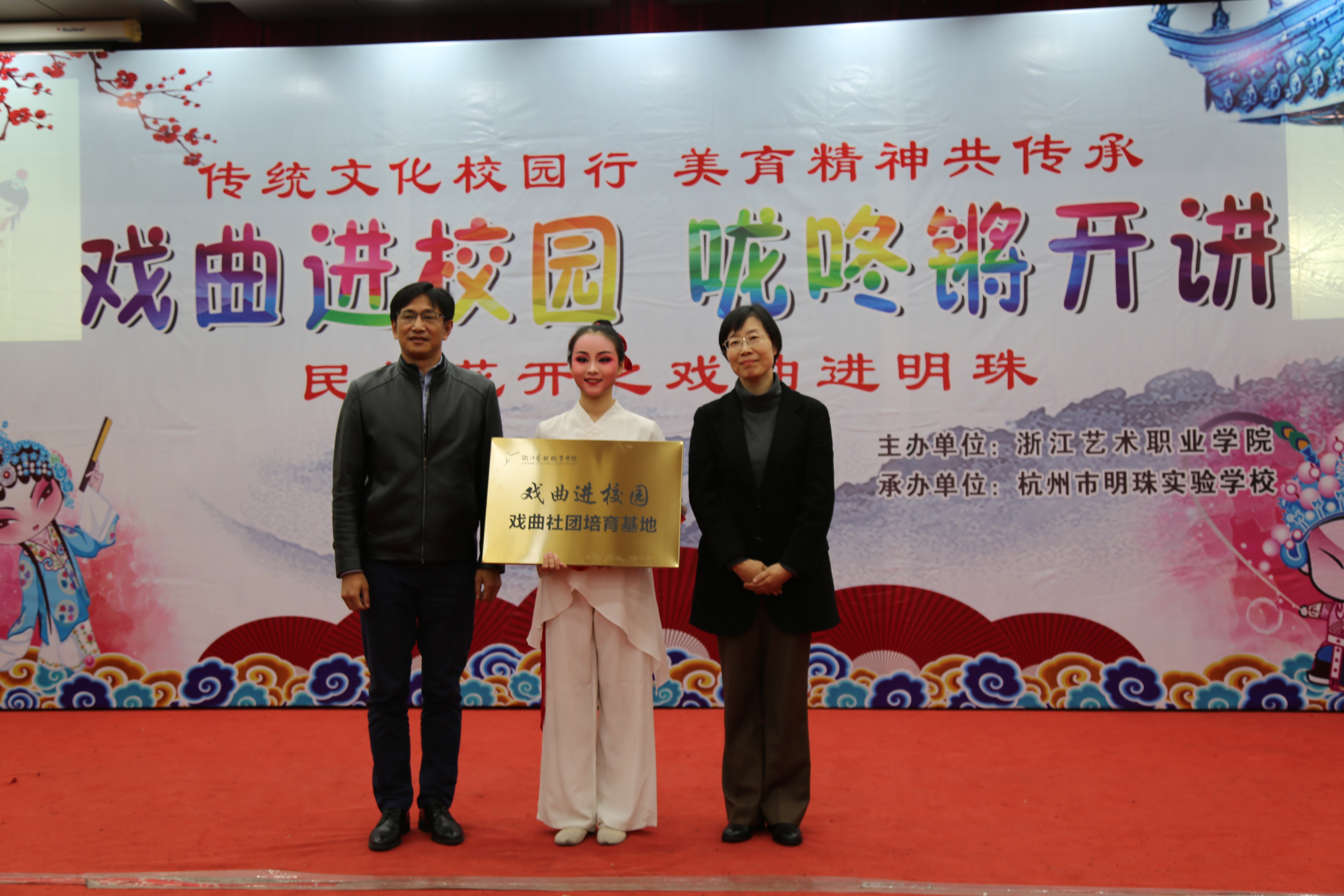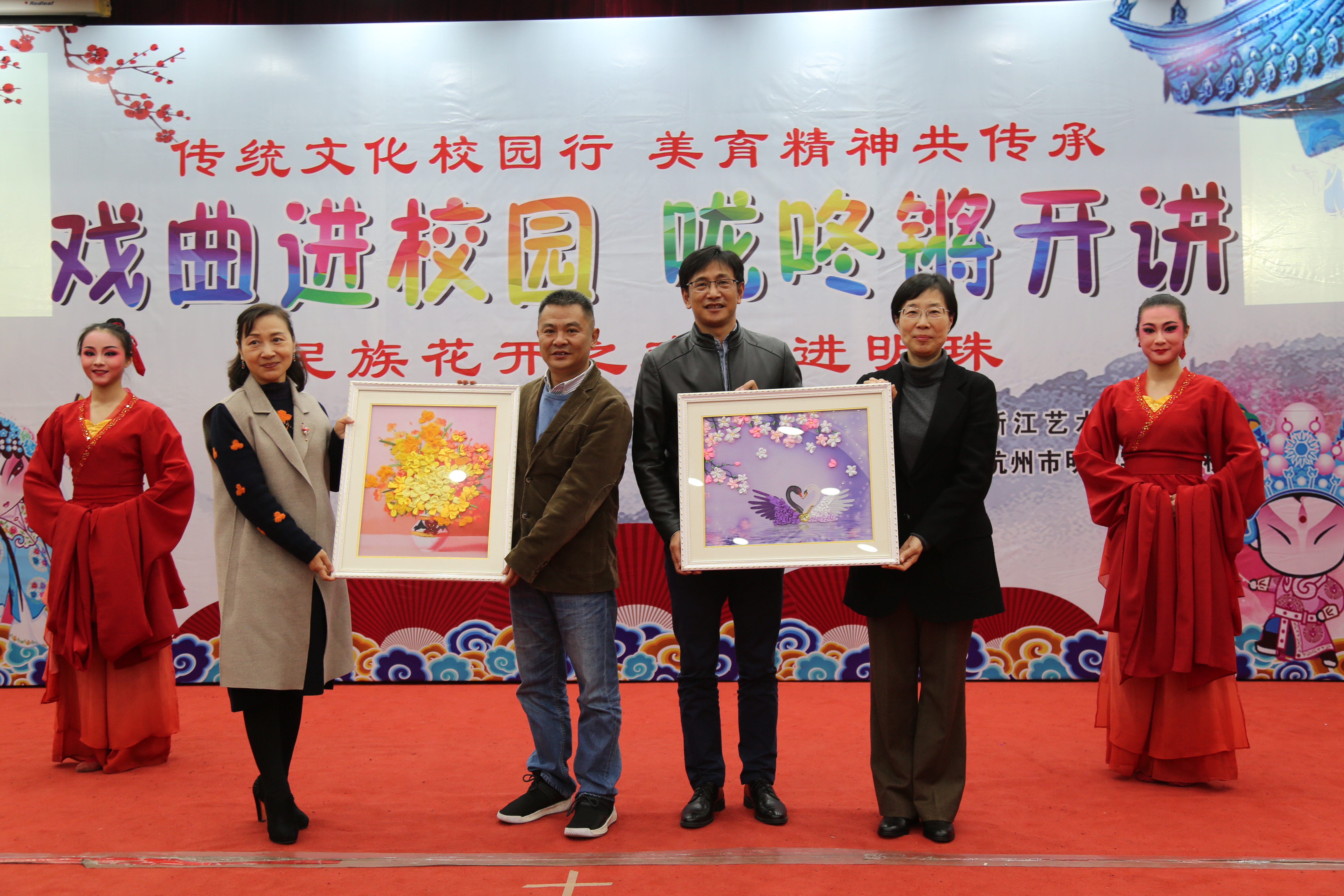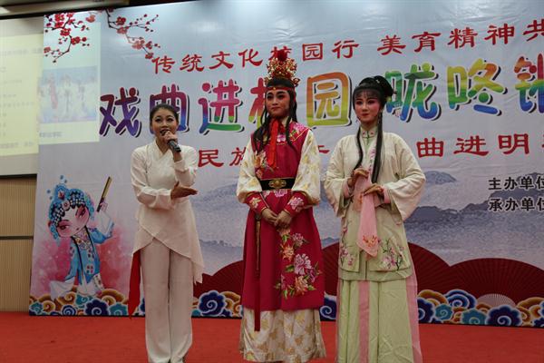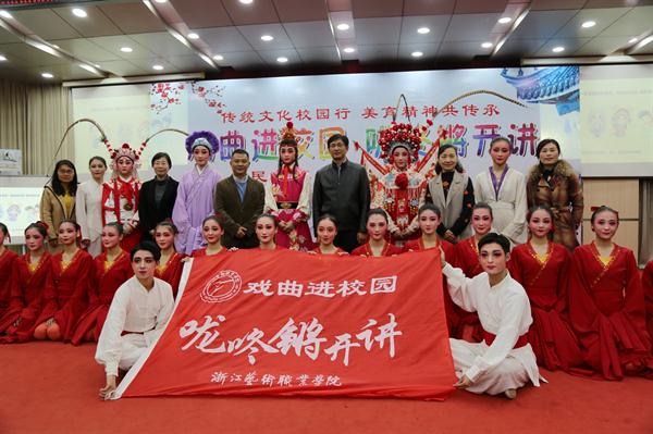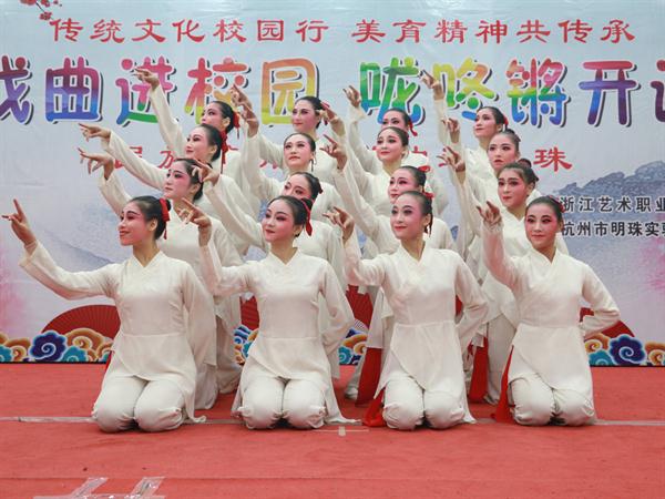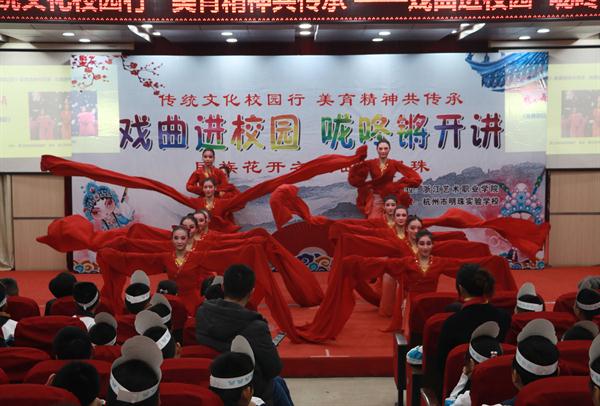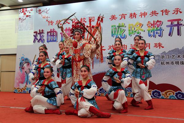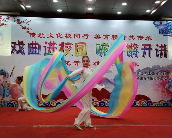 活动还未开场,发到每个学生手中的戏曲头饰就点燃了气氛,有的要鼻子上点个黑点的七品芝麻官,有的要耍着金箍棒的孙悟空,有的要威风凛凛的穆桂英,有的要儒雅的梁山伯……当台上主持人开始讲授戏曲的“唱念做打”“手眼身法步”,他们马上跟着抑扬顿挫地念起来。浙艺师生通过“学一句唱”“念一句韵”等趣味盎然的互动,在“戏之韵”、“戏之唱”、“戏之念”、“戏之做”、“戏之打”和“戏之舞”五个环节,把戏曲高度综合文学、表演、美术、音乐等艺术门类的特色展现得立体鲜活。扇子功的文雅,髯口舞的浓烈,小快抢的惊险,《断桥》台步的复杂,《行路》水袖的飞扬……让同学们体会到戏曲基本功的魅力;《天上掉下个林妹妹》《穆桂英挂帅》《小宴》等折子戏让同学们欣赏到戏曲的唯美。“后掸褶”“旋飞褶”“赶步提衫后飞褶”,水袖、翎子、髯口,相信这些他们从来没有接触过的戏曲名词,通过这次活动会深深印在心底。