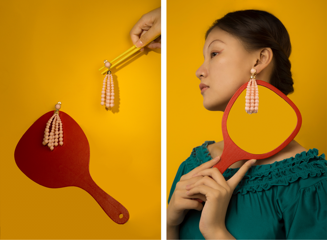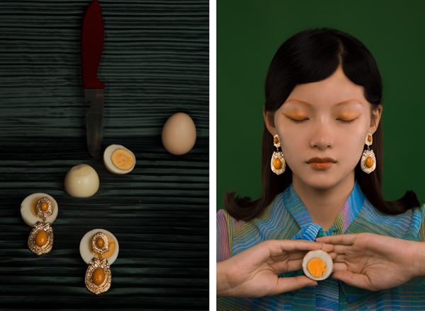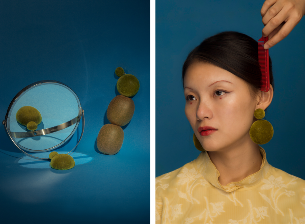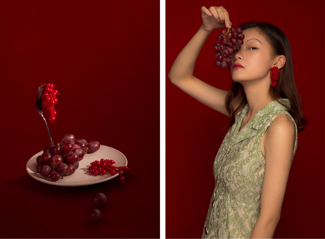 复赛答辩时间为五分钟,要求介绍作品构思、创作过程,进行作品原创性阐释和作品自我评析,并回答专家提问。因林莹莹同学本学期正在台湾进行交换学习,故委托姜思雨(影视技术系16级摄影摄像班学生)进行答辩。获奖作品《明珠︱娉婷》,是一组商业摄影作品,作品选用耳环作为拍摄对象,用两两一组的形式呈现:一张模特佩戴图,一张产品配合道具静物图。作品点睛之处在于,拍摄时道具静物的选择是根据产品的颜色形状来进行联想的,跳出了传统单一的商业静物拍摄,道具选择大胆,运用与饰品完全无关的食物(猕猴桃、鸡蛋等)来进行搭配,为作品整体趣味性加分。