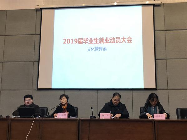 12月7日中午,文化管理系2019届毕业生就业动员大会在图信中心报告厅召开。系党总支书记金银琴、系主任谢青、全体辅导员和2019届毕业生参加会议。