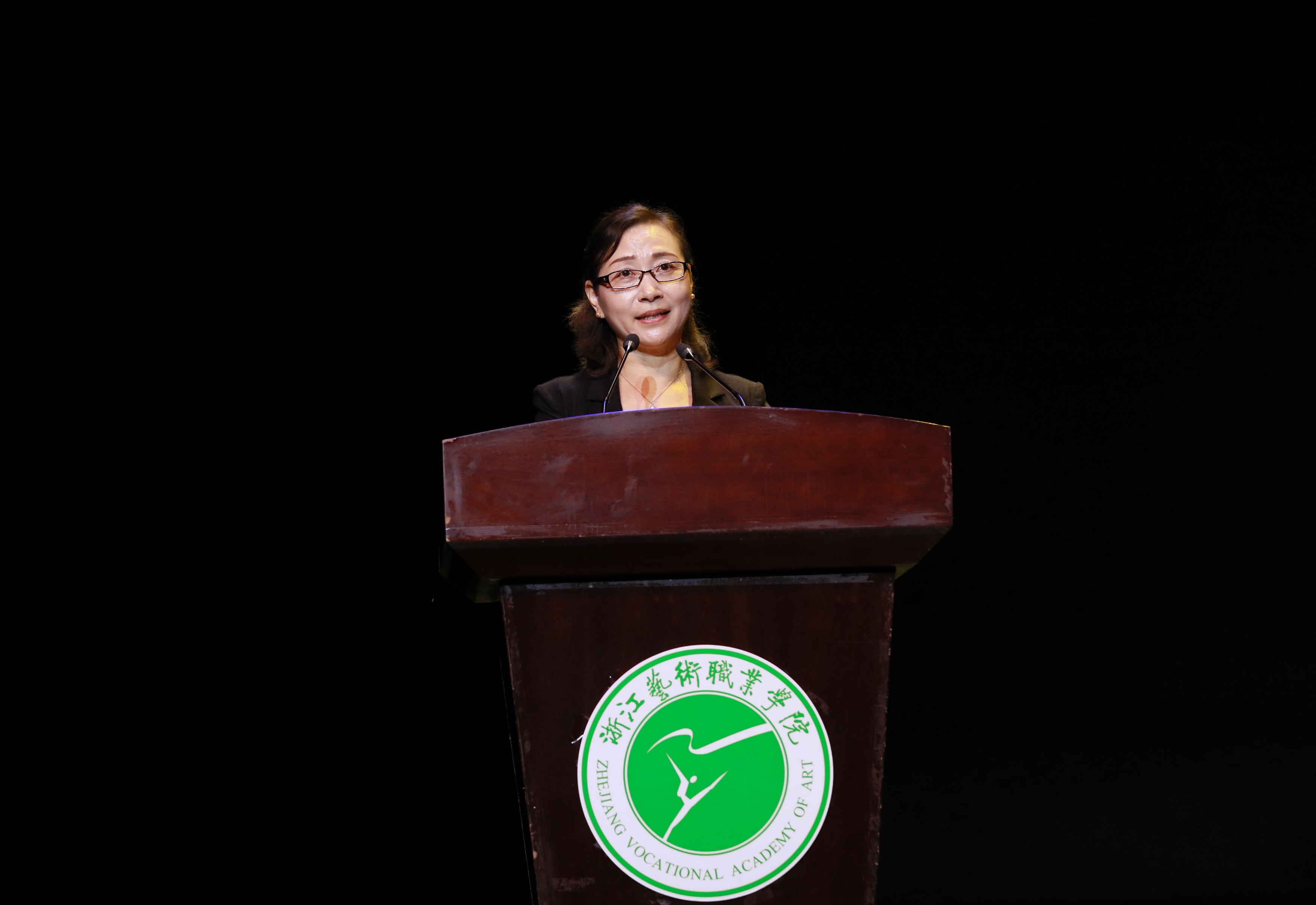 院长黄杭娟致辞,她代表学校党委行政和全体教职工欢迎新同学来到充满关怀、友爱的浙艺大家庭。她饱含深情地向大家介绍了浙艺60多年艺术办学史和承担的时代使命,对同学们的大学生活表达了美好的祝愿并提出希望:要坚定理想信念、厚植爱国情怀、加强品德修养;要增长知识见识、培养奋斗精神、增强综合素质;要树立健康理念、加强美学提升、弘扬劳动精神。