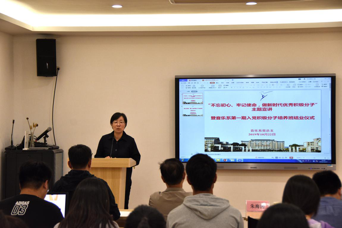朱海闵对27名音乐系第一期入党积极分子培养班学员顺利结业表示祝贺,对主题宣讲的开展表示肯定。她表示,同学们在信仰的起始阶段打下了良好的基础,对主题的解读、感悟、阐释到位,表达朴素真切,对于英雄的尊崇、榜样的敬仰真挚有力。从学员们的宣讲中,看到了当代年轻人的能力和觉悟,感受到学员们展示青春的风采,以及争做新时代追梦人的豪情,难能可贵。她希望同学们能把小我融入大我,拥有海一样宽广的胸怀,山一样高远的志向,不让青春之舟迷失方向漂泊不定,相信大家能够守好初心、扛好责任,走好自己的人生之路。