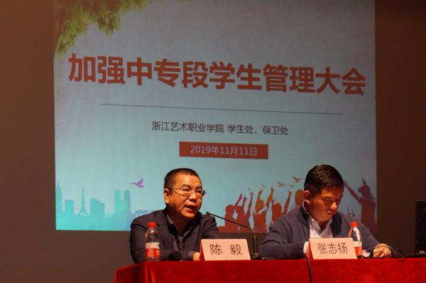 为认真贯彻落实国务院办公厅《关于加强中小学幼儿园安全风险防控体系建设的意见》,根据教育部等九部门《关于防治中小学生欺凌和暴力的指导意见》具体要求,进一步加强中专段学生的法律、校规意识教育,结合我校实际情况,11月11日中午,加强中专段学生管理大会在浙江实验艺术剧场举行。校学工部副部长(主持工作)陈毅、保卫处处长助理张志扬、各系辅导员、班主任、全体中专及五年一贯制学生参加大会。会议由附中学生科科长刘梦伟主持。