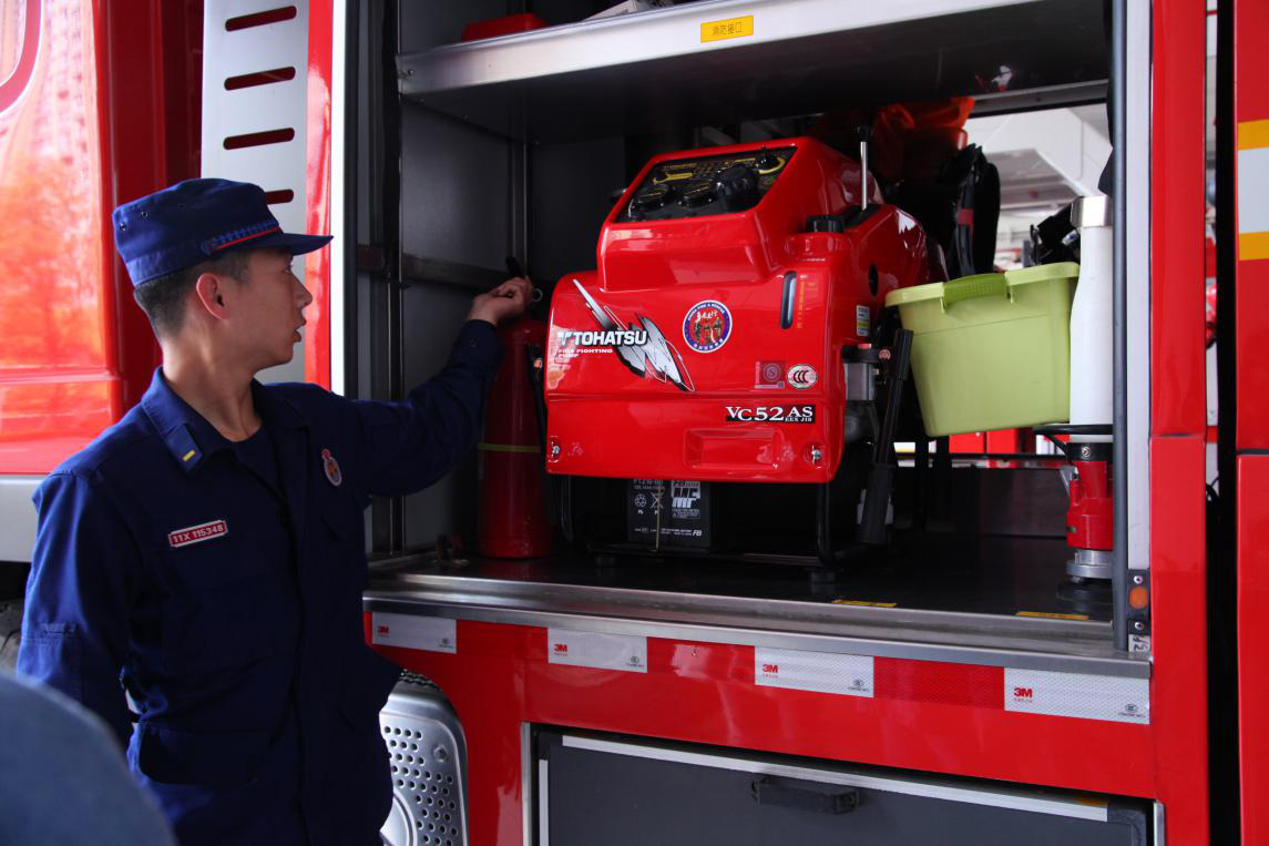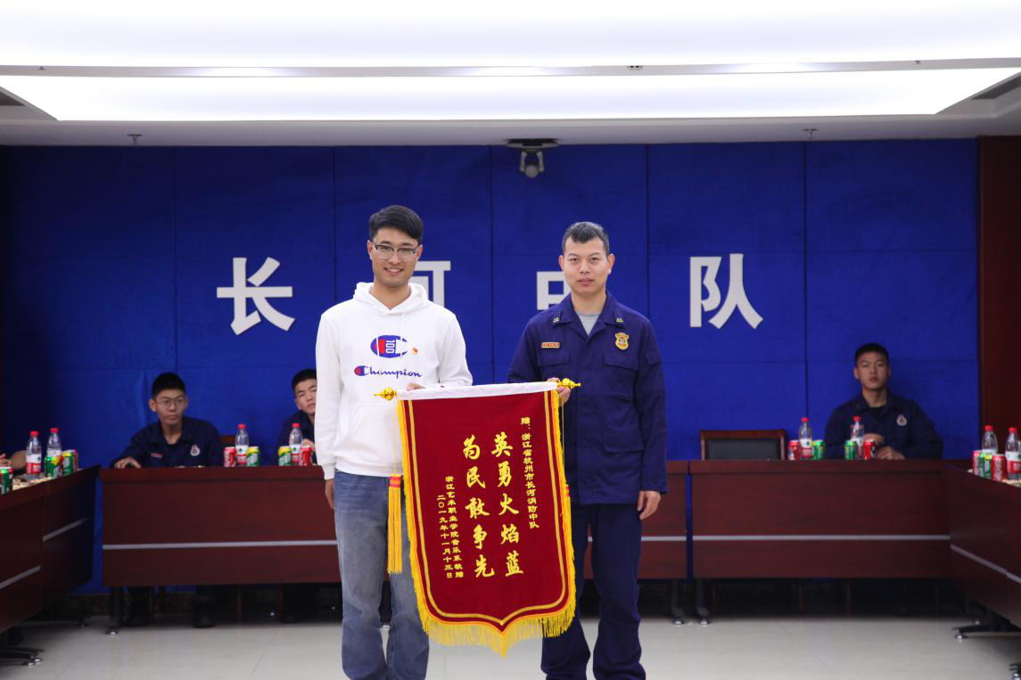 在中队消防战士的带领下,师生们还一起参观了消防车,并与车上的消防器材“零距离”接触,聆听了战斗服、液压破拆组器材、无齿锯等消防器材的使用方法,收获满满。音乐系辅导员陈宏为长河中队送上锦旗,致以崇高的敬意。