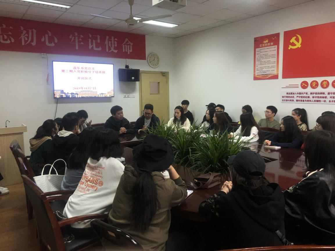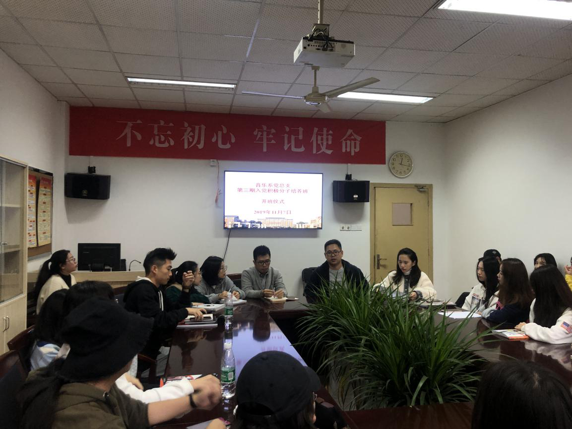 在“不忘初心、牢记使命”主题教育深入开展之际,2019年11月7日,音乐系党总支在系党员之家会议室举行第三期入党积极分子培养班开班仪式,音乐系党总支专职副书记、组织员、学生党支部党员、党务助理、第二期培养班学员代表,以及23名第三期入党积极分子参加。