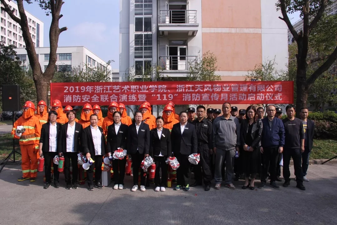 现场,浙艺与浙江天风物业管理有限公司开展了一次消防联合演练,旨在普及消防知识,提高师生安全意识,营造全校“关注消防、生命至上”的浓厚氛围。活动使用立志园一公寓房间做为火灾模拟点,模拟起因是学生违规使用串联接线板,用电负荷超载导致起火。主持人宣布演习开始时,现场师生看见从窗口飘出了模拟火灾发生时的浓烟。