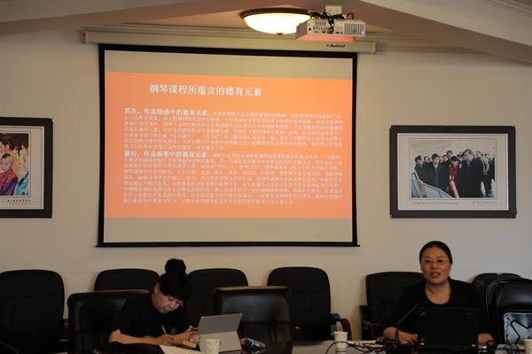 来自7个系部的16名教师代表主要围绕建设背景、教学目标、教学内容、研究计划、预期成果等作“课程思政”项目的陈述和演示。《毛泽东经典诗词越剧新唱》项目推出越剧新创毛泽东诗词演唱作品,以越剧唱腔演绎毛泽东诗词,在越剧唱腔教学和演出实践中是个创新。《文化经济学》项目运用课程自身的“文化”基因,有效融入“三观”教育,挖掘专业知识中的德育元素,实现专业教育与德育培育的有机融合,培养学生的爱国情怀、敬业精神、诚信观念、法治意识以及义利观、民主观、文明观,发挥课程文化育人的功能。《计算机应用基础》项目从“历史文化、科技发展、理想信念、政治经济、安全技术”5个方面着手,搜集案例和学习素材,通过讲述计算机在中国的发展、中国芯片的发展,中国自主研发的巨型机、5G、电子支付等案例,引导学生对中国的科技文化充满自信,对中国发展充满自信。《表导演创作与实践》《钢琴专业课程》《舞蹈素材》《声乐》《音乐剧表演》等技能技艺类课程,倡导在知识传授、技能训练过程中引导学生悟道、立德。
