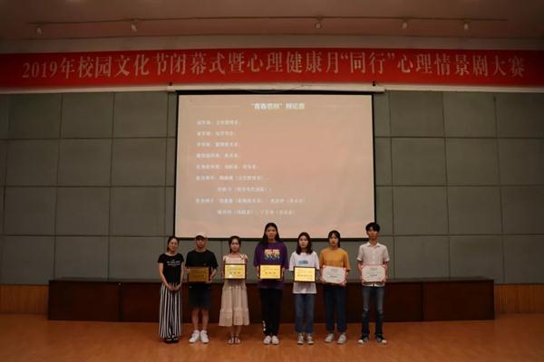 马向东代表校党委致闭幕词,对校园文化节的成功举办表示热烈的祝贺,并为心理情景剧获奖团队颁奖。戏剧系《同学会》获得一等奖;文化管理系《十八岁的礼物》和影视技术系《友谊·同行》获得二等奖;美术系《与你同行》、音乐系《那些花儿》、舞蹈系《余光未及之处》获得三等奖。
