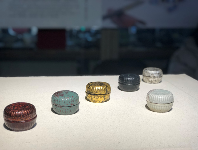 另一件是黛,也就是古时候女子化妆的粉饰盒。我首先被它的外观吸引,小巧玲珑,甚是可爱。后来听了学长学姐说,这是他们从二手的古玩市场淘来的东西,通过搜集各种资料,对他进行上漆修复,最后呈现出了不同颜色的四个成品。因为时间太仓促,有些内部的漆还都没有完全完成。这时候我突然发现,原来文物的修复,不仅仅是修复这么简单,更要清楚知道这件古器的“简历”,才能更好地进行修复。