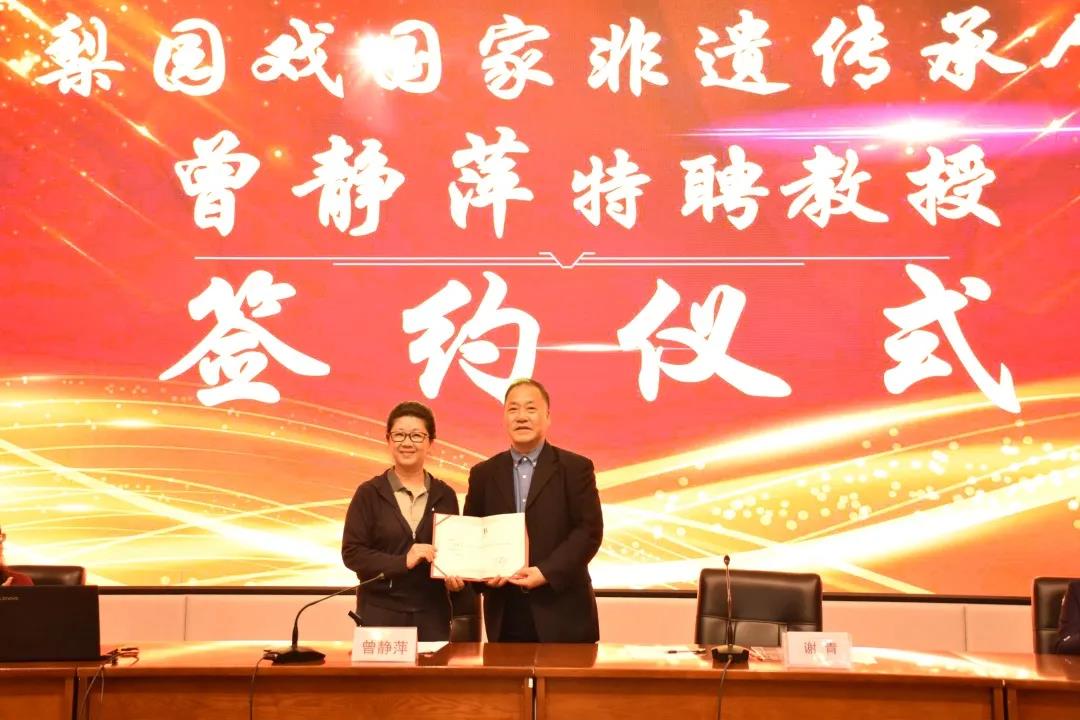 戏曲学院党总支书记、副院长谢青为曾静萍颁发特聘教授聘书,现场签订了特聘教授协议。谢青在仪式上介绍了学校历史发展、未来重任和“双高”建设背景,希望在特聘教授引领下,进一步在专业建设、师资队伍、人才培养等方面带来更高的发展平台。