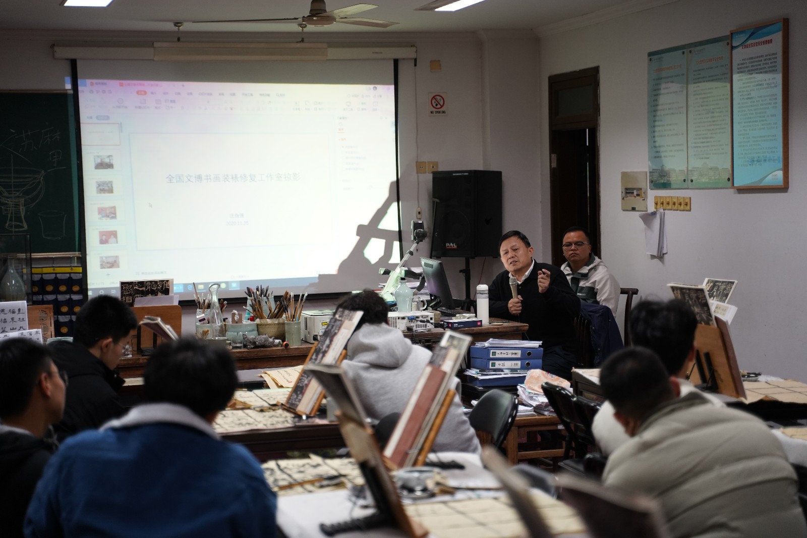 汪自强系统地介绍了当下中国文博书画装裱专业的现状与发展前景,展示了众多各省市级博物馆与各高校文物修复工作室的掠影,详细描述了不同工作室的侧重方向,以及在文博书画装裱方面具有杰出贡献的专家教授。同时,汪自强还展示了美国各博物馆修复馆室掠影,将中西方文物修复馆情况相对比,在扩充知识面的同时,也让同学们能够更好的了解中国文物修复专业的独特优势与当前的不足。