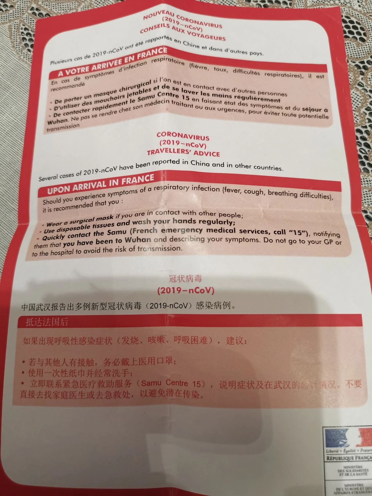 在朋友们的期盼下,更多的是为了采购口罩吧,2月1日我踏上了法国的旅程。法国人心真大,出关时就给了我一张告知单,其他啥措施也没有,大街上也没人戴口罩,我心想这下口罩可能有戏。