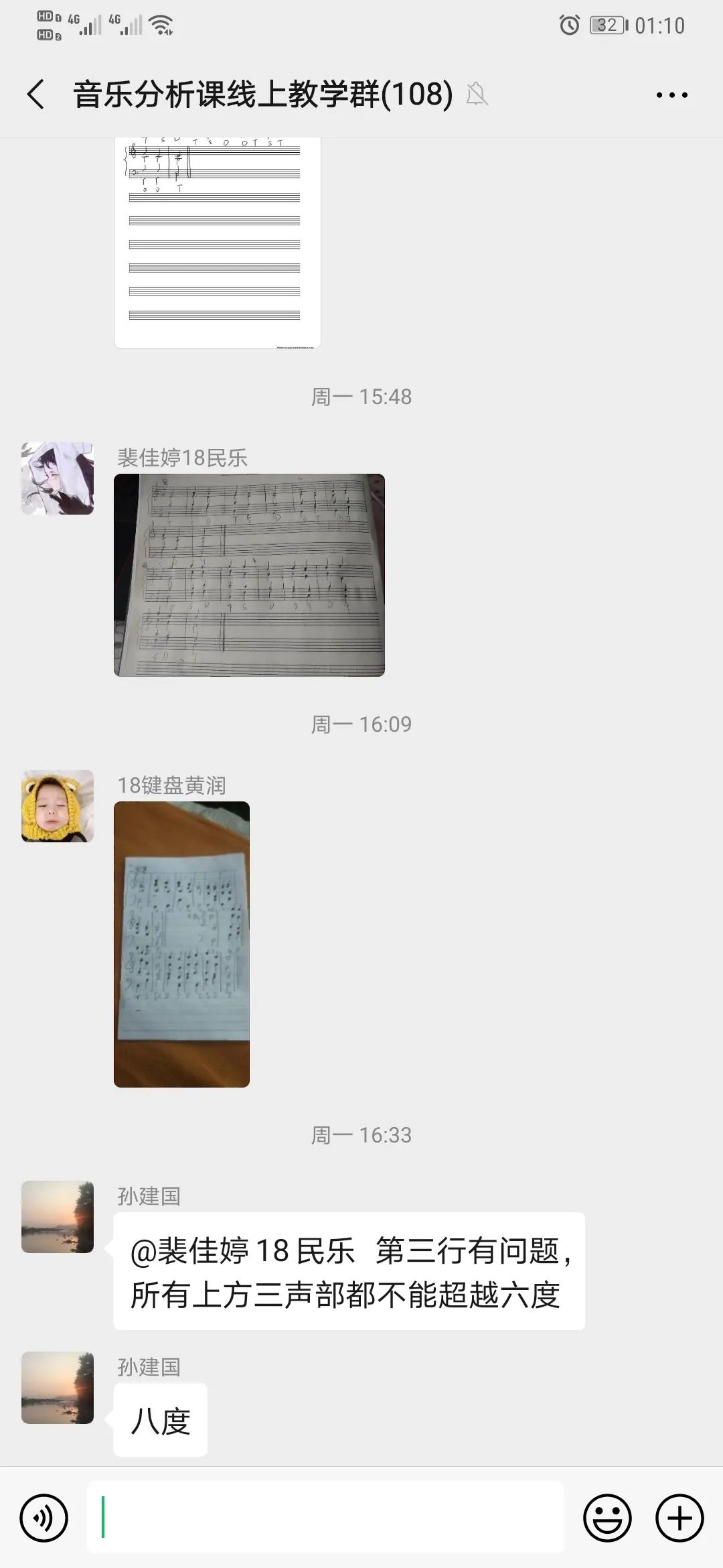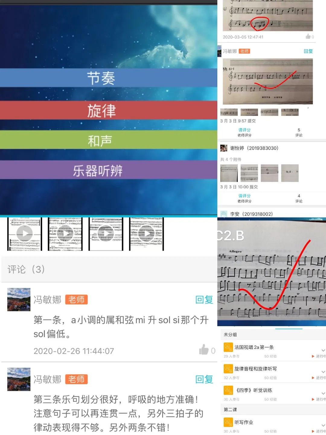 理论大课,如音乐欣赏、音乐简史、视唱练耳、乐理、音乐分析等,均为集体授课,全部由理论教研室承担教学。老师们利用自身积累的课程视频资源,结合网上共享慕课资源,录制微课、速课,制作音频和视频,通过超星学习通、云班课、微信群等开展教学,安排线上作业与测试。网络课堂上,师生间的文字、语音、视频互动,轻松而又亲切,虽然隔着屏幕,却能感受到浓浓的欢乐的学习氛围。