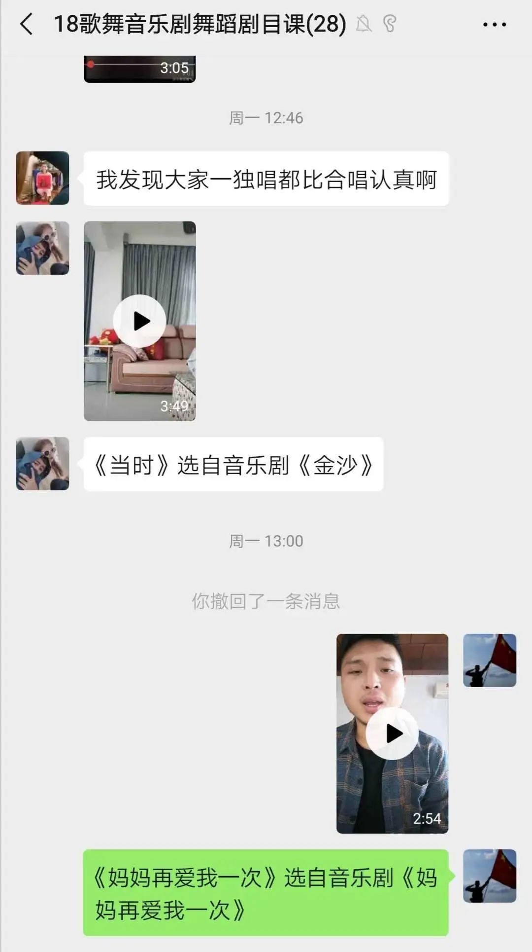 集体实践大课,如重奏与合奏、重唱、合唱、外国语语音、舞蹈基训、民间舞、表演、形体、音乐剧表演等课程,由民乐、声乐、歌舞、管弦、键盘、流行、音乐剧等教研室承担教学。老师们通过微信、钉钉,将精心准备的一堂堂精彩网课,通过直播或实时互动的方式,纷纷搬上云舞台。各类学习APP和学习群里的语音、视频打卡成了老师和学生间的互动日常,大家忙得不亦乐乎。