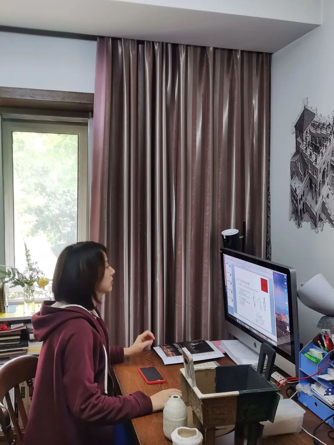 网络授课并不是一切顺利,田旻需要教同学们自己动手操作来理解空间概念。但网课并不能面对面让老师手把手教同学们运用材料制作,而且由于学生们运用的材料不一定有,甚至有些家处偏远的学生们根本无法实现取材方便,所以如何让学生们能够将理论付诸实践成了一大难点。于是田旻用图纸给同学们做示范,理论课上为了更加方便同学们理解,经常自己制作模型,根据模型来进行分析。对新疆西藏的同学则是提供取材的点子,建议就地取材来实践。她还通过一对一的讲解和示范,引导和启发学生思考,让学生自己带着问题把玩材料,去感悟和理解。
