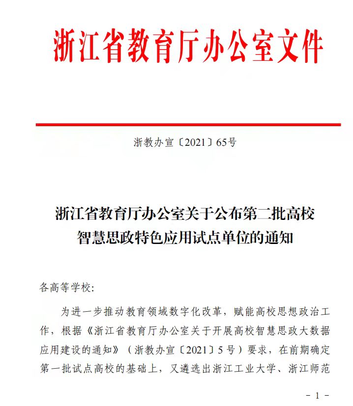 浙江省教育厅公布第二批高校智慧思政特色应用试点单位名单与应用场景建设单位名单,我校成功入选,“运动啦·活力在线”被列为高校智慧思政特色应用场景建设单位。此次共有浙江工业大学、浙江师范大学、中国计量大学等15所高校入选试点单位。