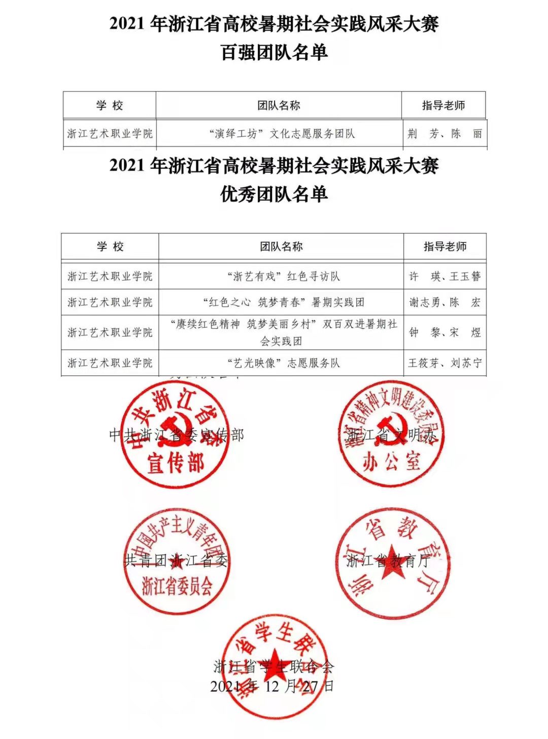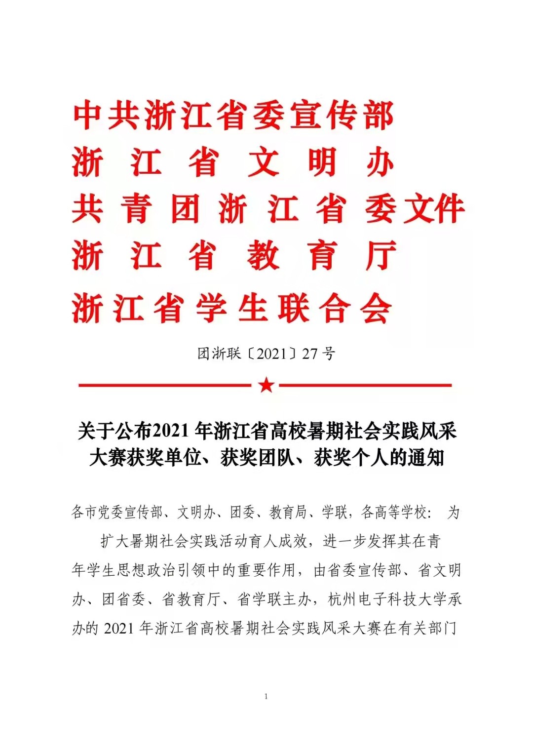 浙江省委宣传部、省文明办、团省委、省教育厅等单位联合发文公布“2021 年浙江省高校暑期社会实践风采大赛”获奖情况。