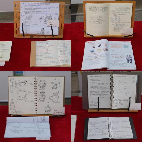 一本本精美丰富的笔记整齐地摆放在展桌上,笔记中工整清晰的字迹,图文并茂的内容,让老师与同学们纷纷驻足欣赏,工作人员们热情亲切地向参观展览的老师与同学们介绍笔记的内容。展出的笔记内容多彩多样,手绘的彩陶图样,形体动作的详细记录,英语语法,文学常识……通过笔记,学生们展现着他们多姿多彩,忙碌而又充实的学习生活,积极向上,一丝不苟的学习态度。