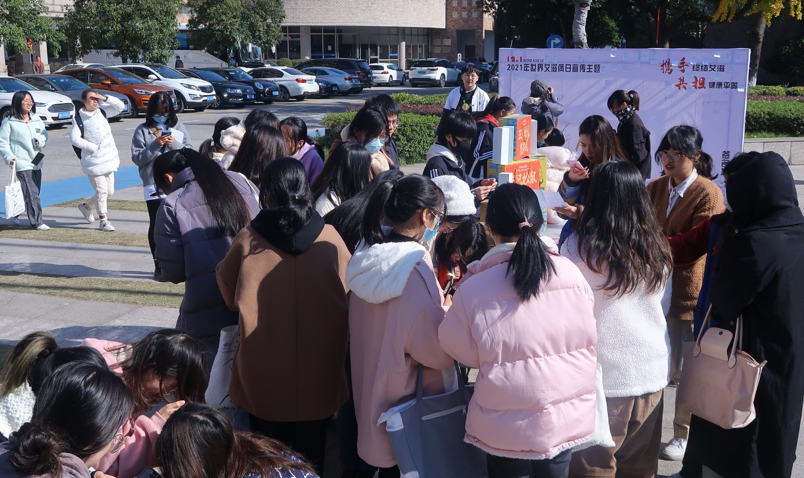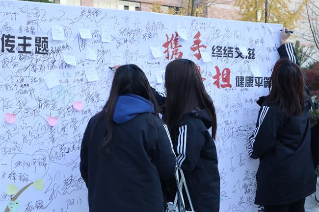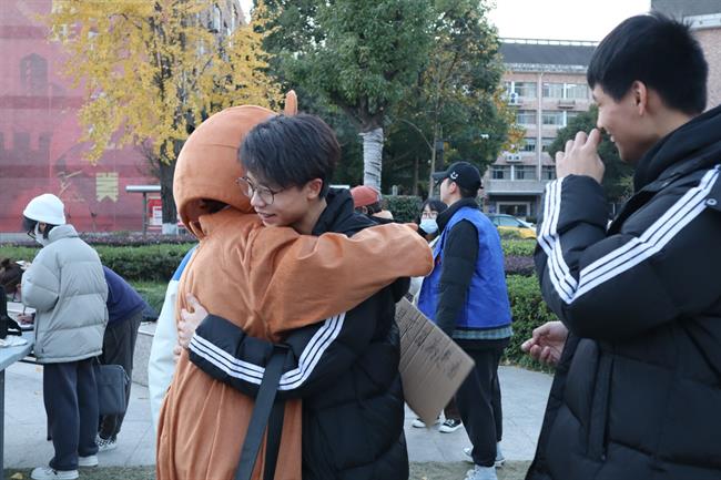 防艾知识宣传。121日起,校团委在学校中心广场设立防艾宣传点,向全校师生宣传防艾相关知识。身穿玩偶服的“艾滋病感染者”和大家互动拥抱,充分地让大家正视、尊重艾滋病感染者。往来的同学们更是在签名版上留下了自己对艾滋感染者的心语心愿。