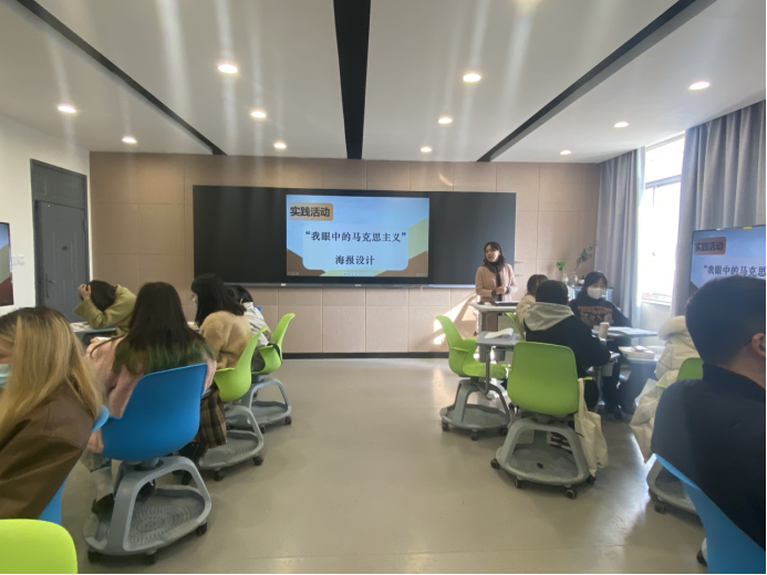 12月6日下午,社会科学部副主任、《马克思主义基本原理》课程主讲教师胡卓群8707智慧教室开展“我眼中的马克思主义”海报设计》实践教学活动课,课上邀请到美术系广告设计专业带头人、视觉传达设计专升本班班主任叶峰泉副教授作专业点评,美术系2021级视觉传达设计专升本班39名同学进行原创海报设计作品展示。