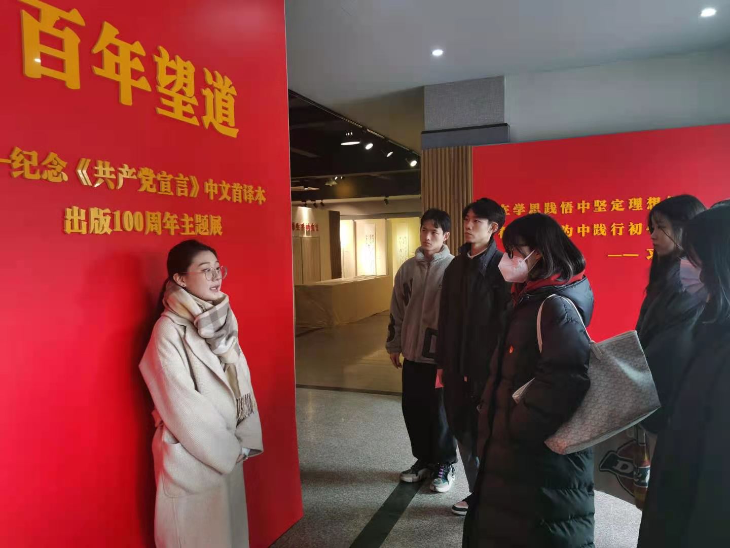 随后,全体党员、部分入党积极分子36期党校学员前往美术系参观“百年望道”——纪念《共产党宣言》中文首译本出版100周年主题展。在美术系孙梦悦同学的讲解下,大家全面了解《共产党宣言》的写作背景、主要内容、本质特征当代价值,陈望道的生平及早年翻译《共产党宣言》的经历,再现了马克思主义走进中国,一百年前中国的先进知识分子对“真理味道”不懈追寻的画面。大家还参观了美术系学生设计的主题海报、全校100位师生手抄的《共产党宣言》等精彩作品。