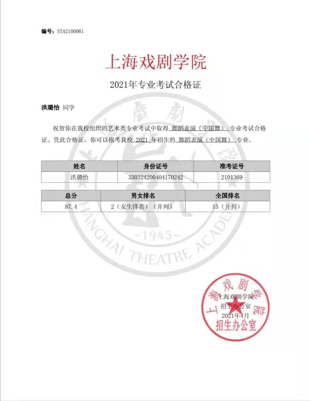 近日,全国各大艺术类本科院校校考专业成绩陆续公布,我校舞蹈系附中2015级舞蹈表演班23名同学以优异成绩分别通过中央戏剧学院、上海戏剧学院、中央民族大学、浙江音乐学院等知名艺术院校的本科入学专业考试,有的同学还同时收获了多个院校的专业考试上线通知。