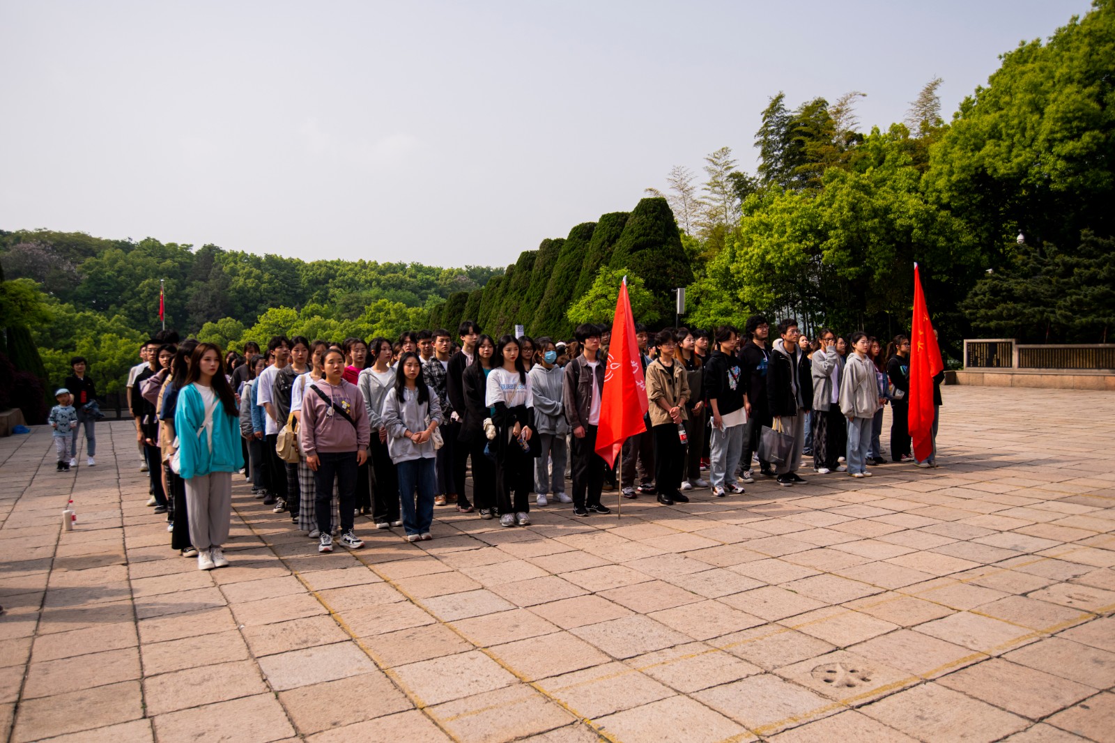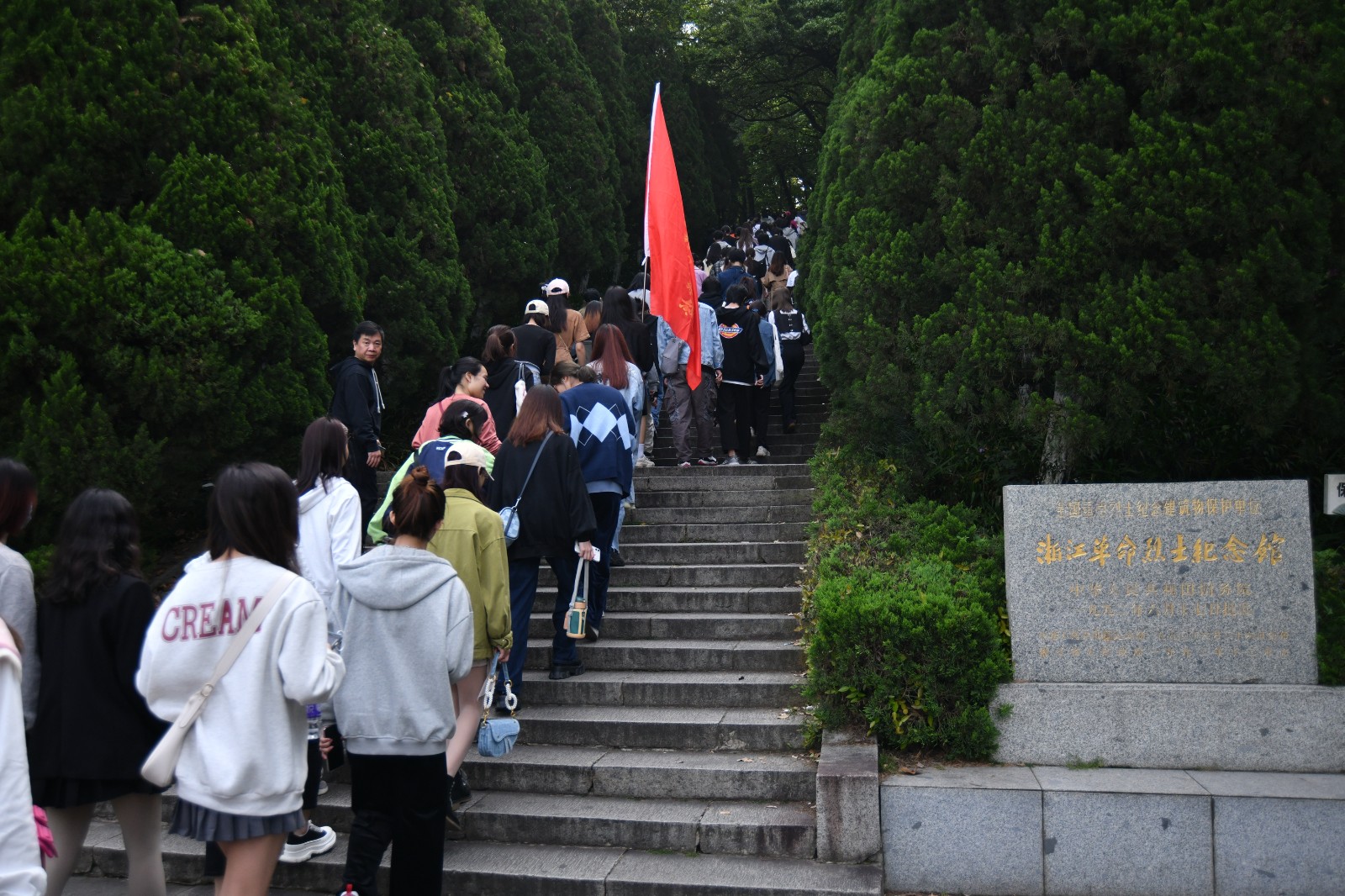 踏上一级级台阶,穿过绿荫茂盛的石板路,大家都沉浸在这庄严的氛围中。天气晴朗,阳光明媚,听得见清脆的鸟叫声,也让人追忆起那些英勇无畏的身影。