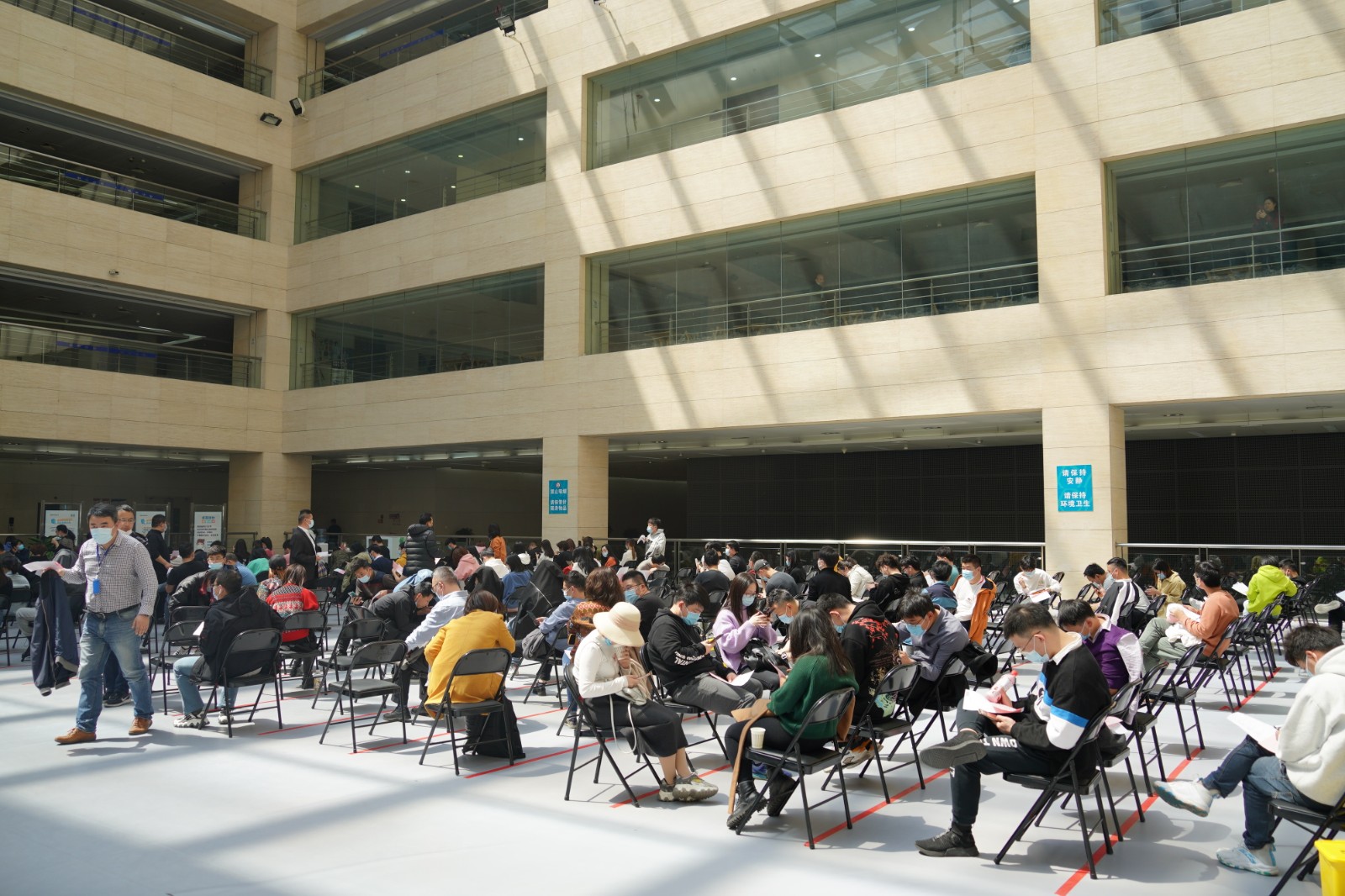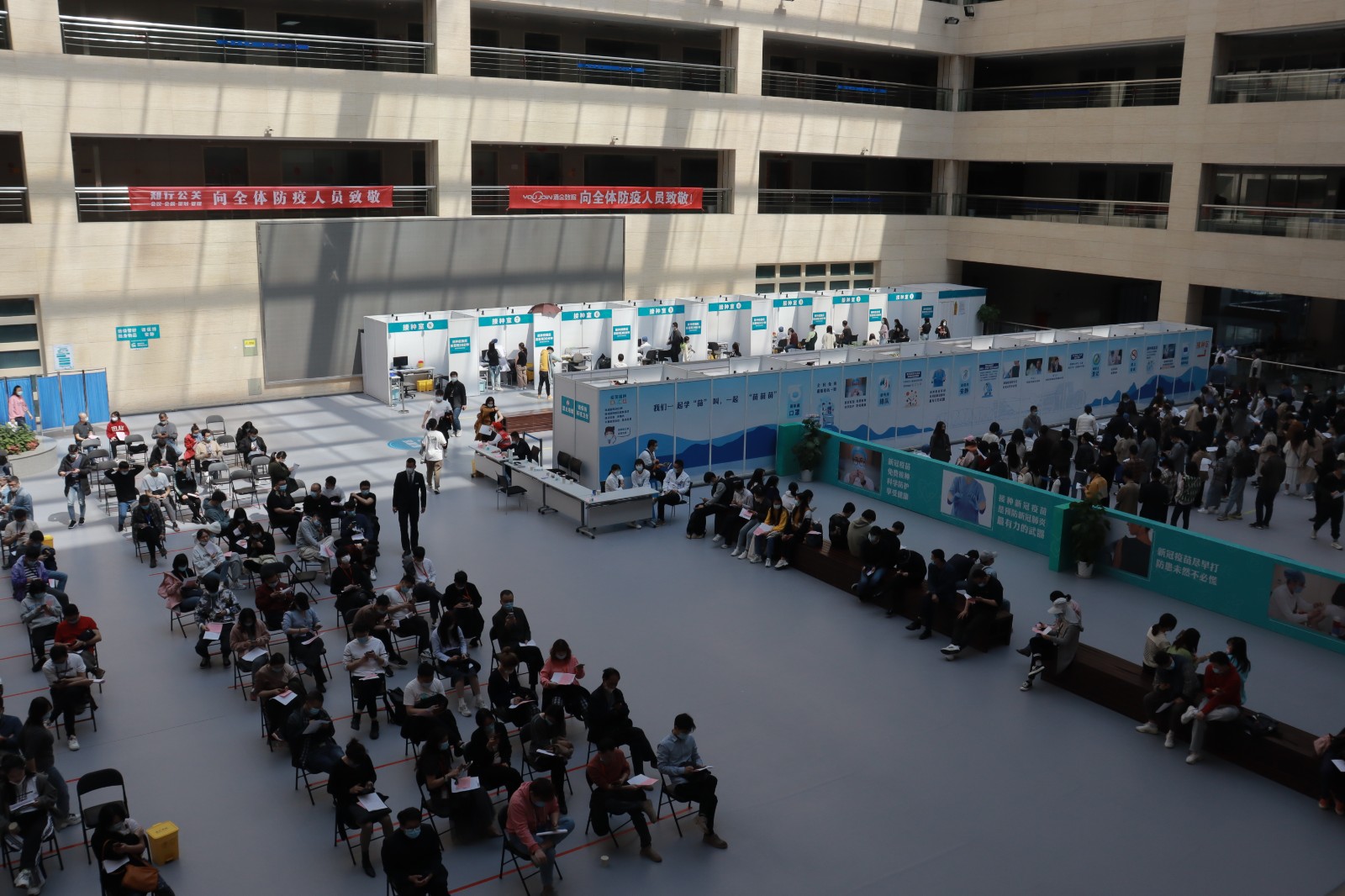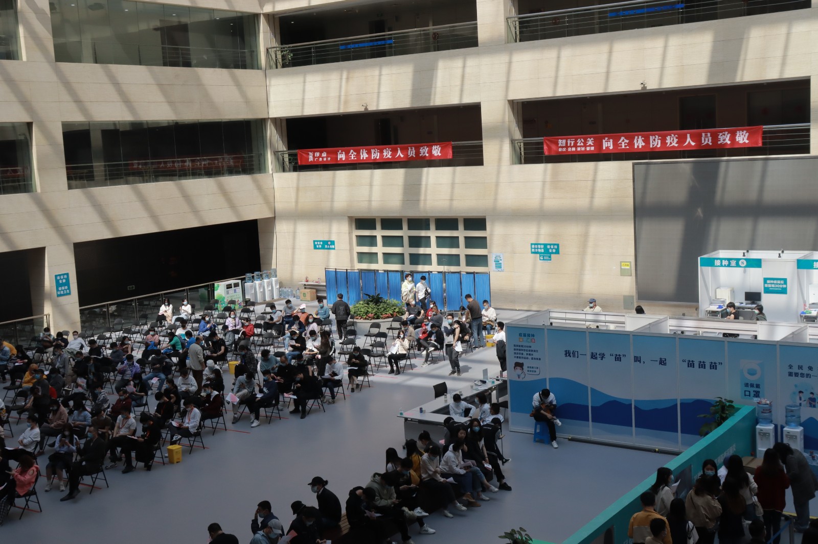 方舱临时接种点按照流程设置了个功能区域,进出都是单向通行,设置有多引导咨询通道12个预检台、16个接种室、上百个留观座位,确保接种工作顺利进行。