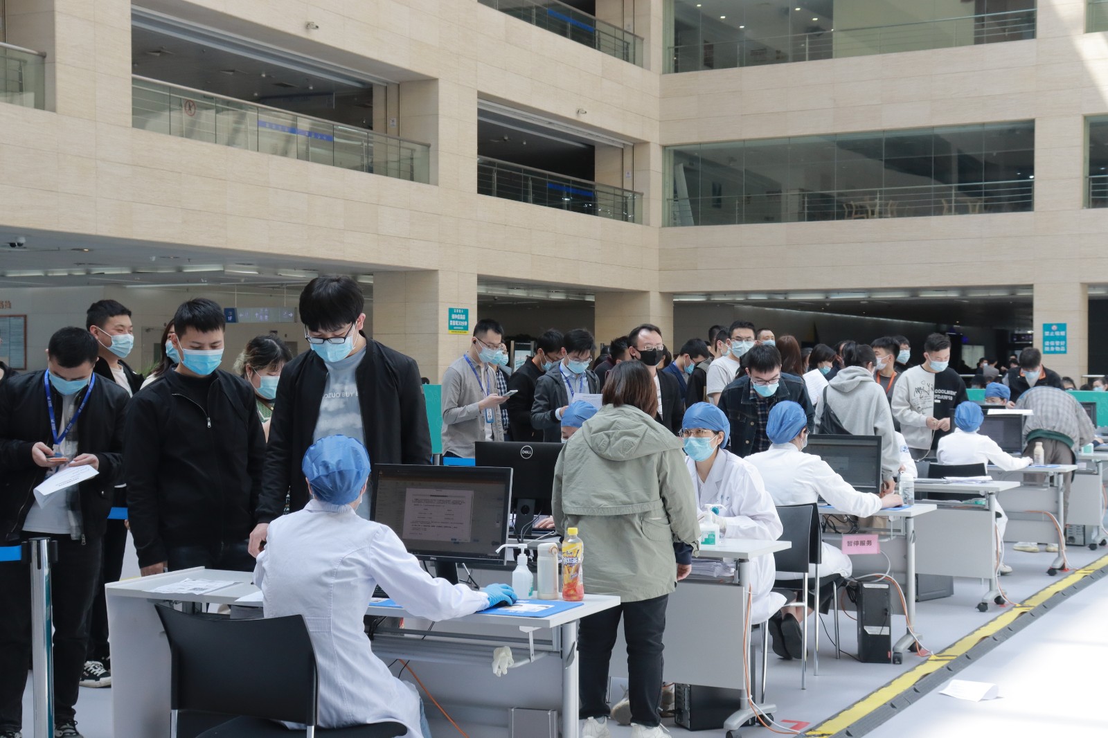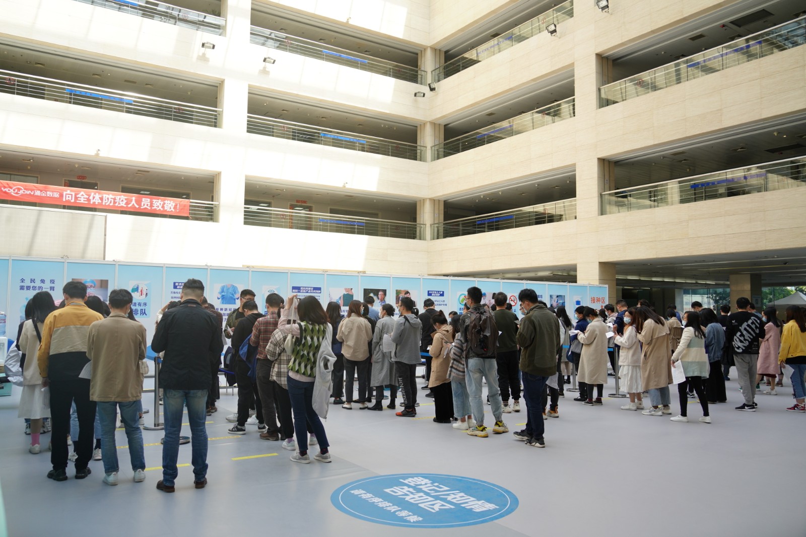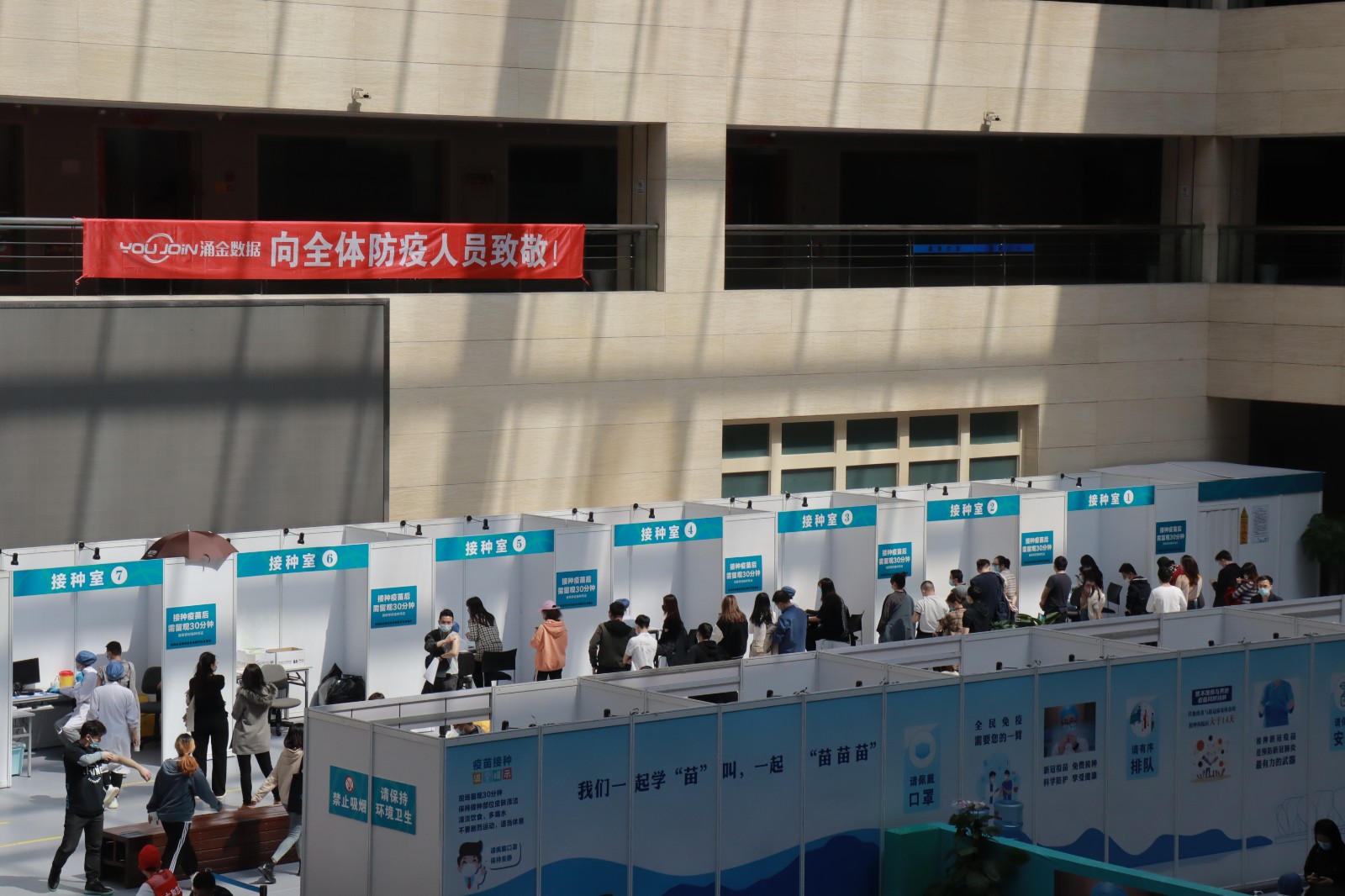 方舱临时接种点按照流程设置了个功能区域,进出都是单向通行,设置有多引导咨询通道12个预检台、16个接种室、上百个留观座位,确保接种工作顺利进行。