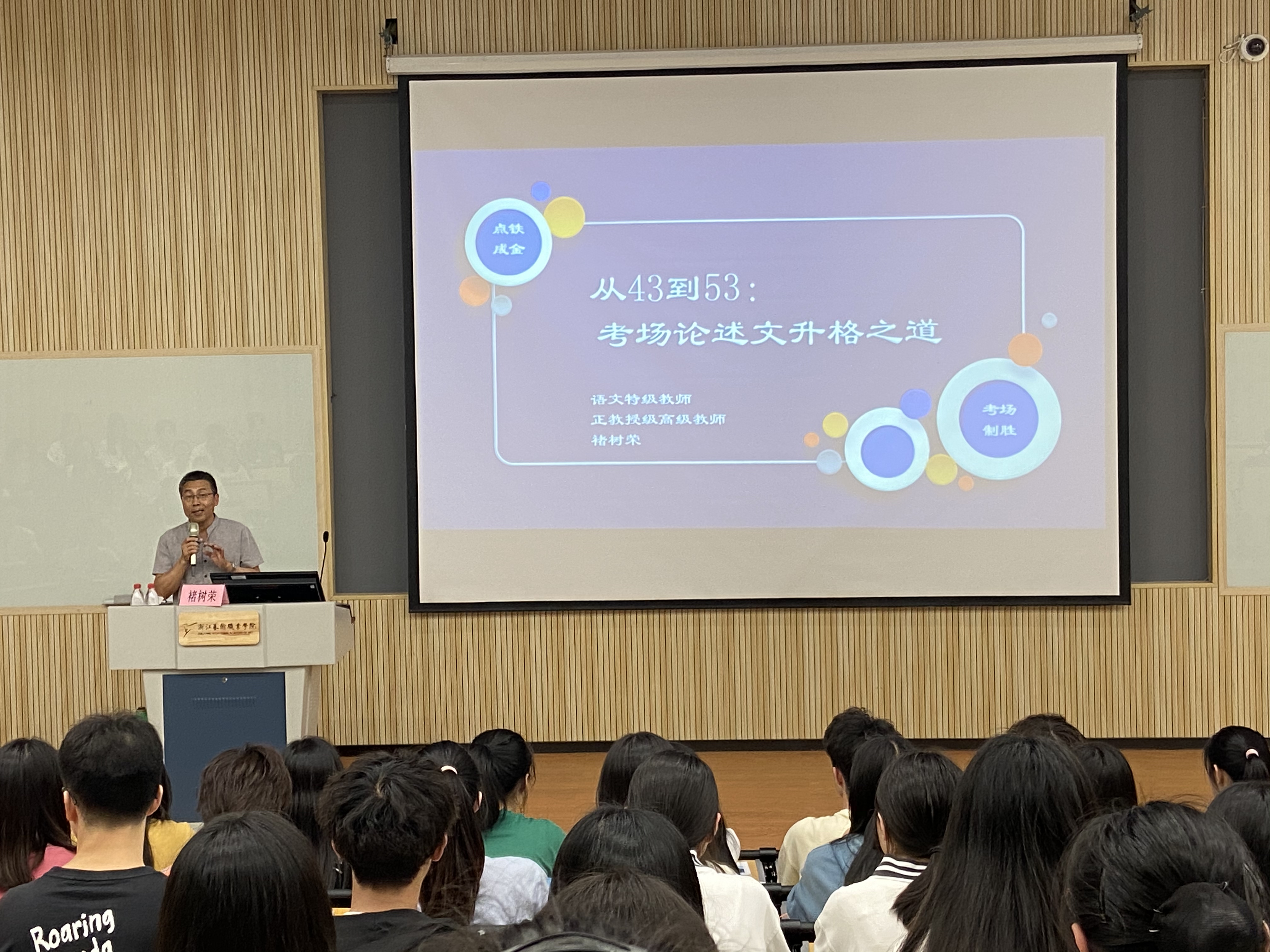 512日下午,我校基础教学部邀请浙江省高中语文特级教师、二级教授褚树荣,为中专段学生就高考论述文写作开展专题讲座。