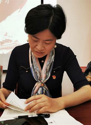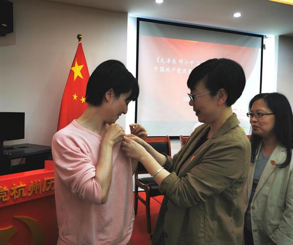 会议最后,党总支为入党日5月份的巴蕾、陈蔚和胡晨菲三位同志举行集体“政治生日”会。汪琳为三位同志重新佩戴党徽,党员教师李雪芬为她们赠送美术系专属设计的政治生日贺卡。