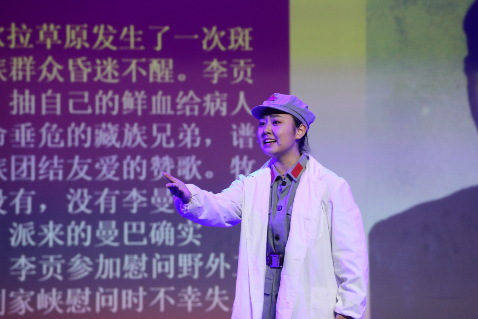 “妈妈教我一支歌,没有共产党就没有新中国…… ”2019级越剧小百花班同学们以优美深情的合唱《妈妈教我一支歌》,拉开了演出帷幕;已经毕业的2018级(3+4)越剧班学生以艺术形式生动再现了《抗日英雄王二小》的感人故事;2018级越剧南京班同学们饱含深情地讲述了倍受甘南藏族人民爱戴和尊敬的《红色医生》的故事;2019级越剧小百花班同学们朗诵的《红船》令观者热血沸腾。