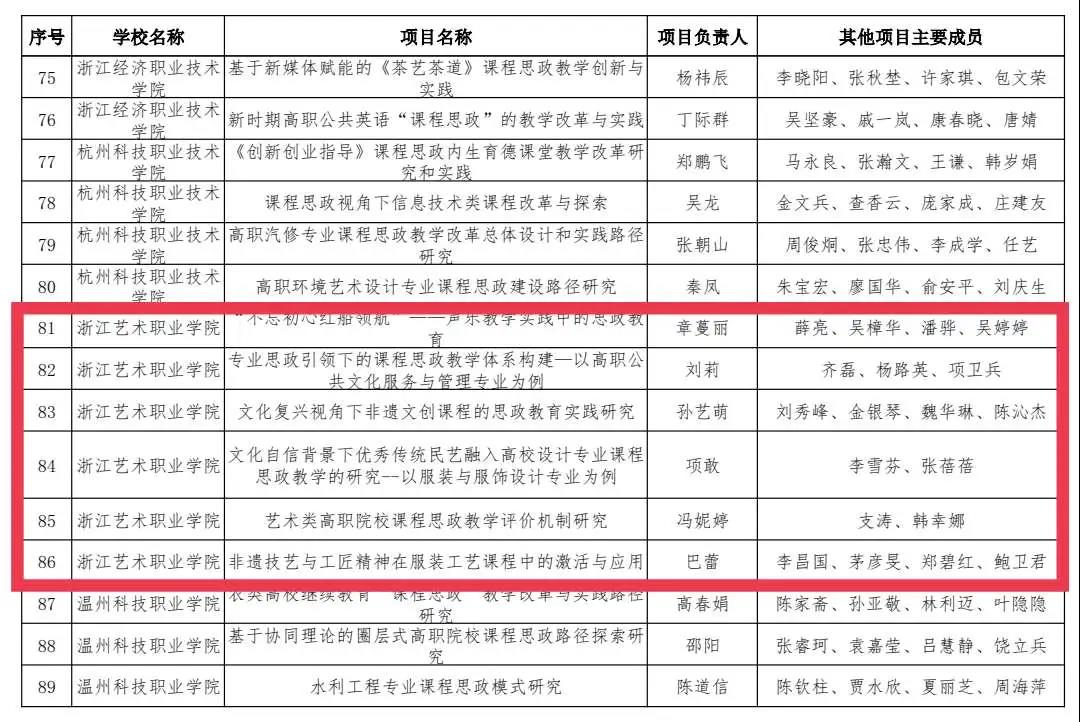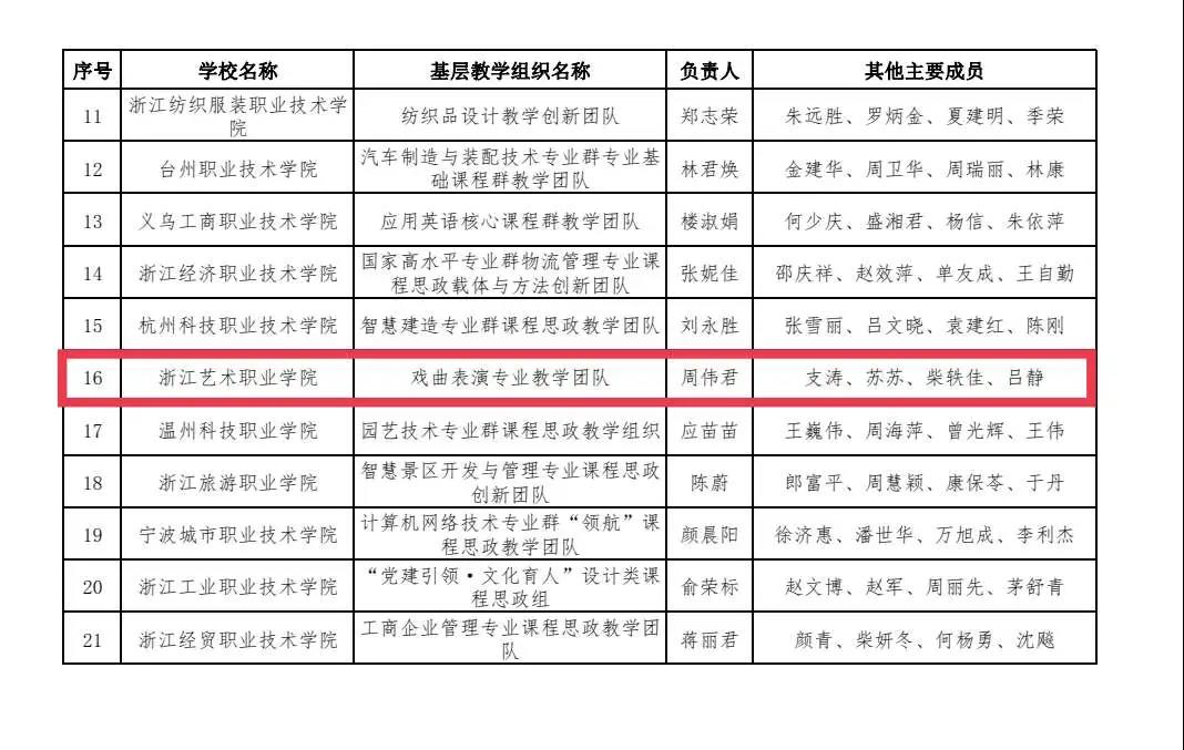 昨日,第一批省级课程思政教学项目立项名单公示,浙艺杨晓浤负责的《越剧<唱腔>》、那刚负责的《台词》和曹亮红负责的《舞蹈剧目》三门课程思政示范课程立项。浙艺章蔓丽负责的《“不忘初心红船领航”——声乐教学实践中的思政教育》、刘莉负责的《专业思政引领下的课程思政教学体系构建——以高职公共文化服务与管理专业为例》、孙艺萌负责的《文化复兴视角下非遗文创课程的思政教育实践研究》、项敢负责的《文化自信背景下优秀传统民艺融入高校设计专业课程思政教学的研究——以服装与服饰设计专业为例》、冯妮婷负责的《艺术类高职院校课程思政教学评价机制研究》和巴蕾负责的《非遗技艺与工匠精神在服装工艺课程中的激活与应用》六门课程思政教学研究项目立项。周伟君负责的基层教学组织《戏曲表演专业教学团队》立项。